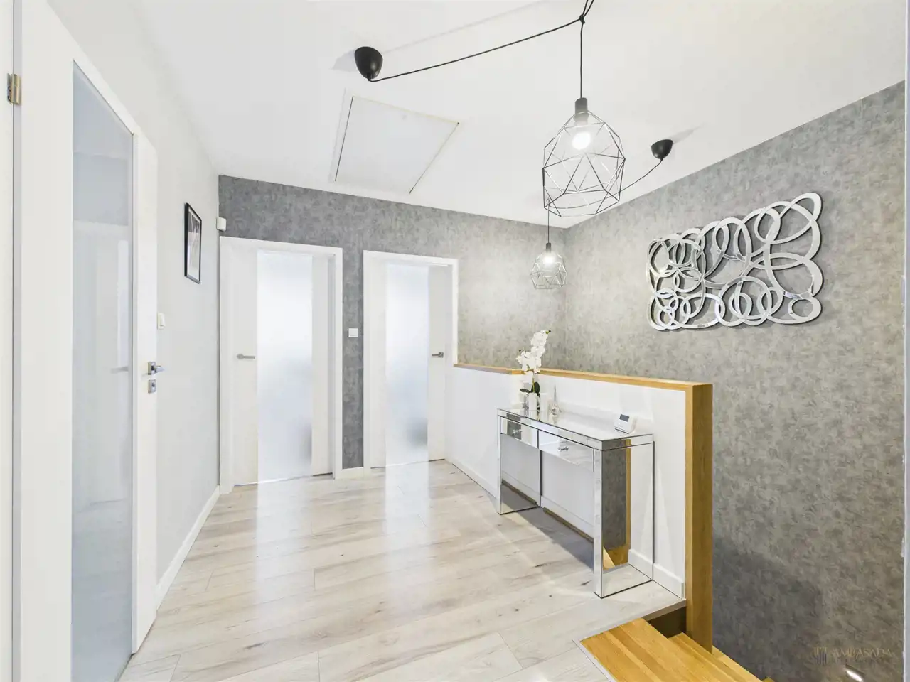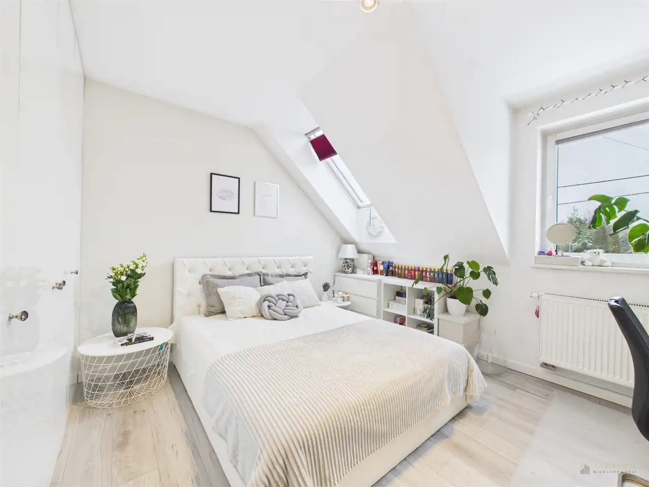 Na piętrze znajdziemy przestronną sypialnię z prywatną łazienką, szafami w zabudowie i garderobą. Wnętrza wykończone w klasycznej i spójnej kolorystyce, króluje tu biel i czerń. Pralnia z miejscem do przechowywania i oknem. 2 ustawne sypialnie z wbudowanymi szafami oraz oddzielna łazienka również z oknem to wygodny podział stref. Piętro ogrzewane grzejnikami.