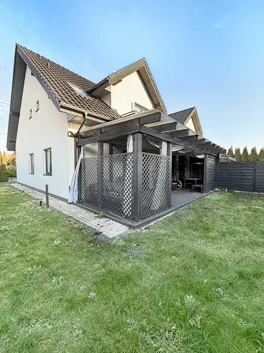 Taras i niewielki ogród to miejsce stworzone do relaksu oraz rodzinnych spotkań. Dojazd do posesji drogą asfaltową, brama wjazdowa z napędem elektrycznym. Media: ogrzewanie piecem gazowym, kanalizacja i woda miejska.