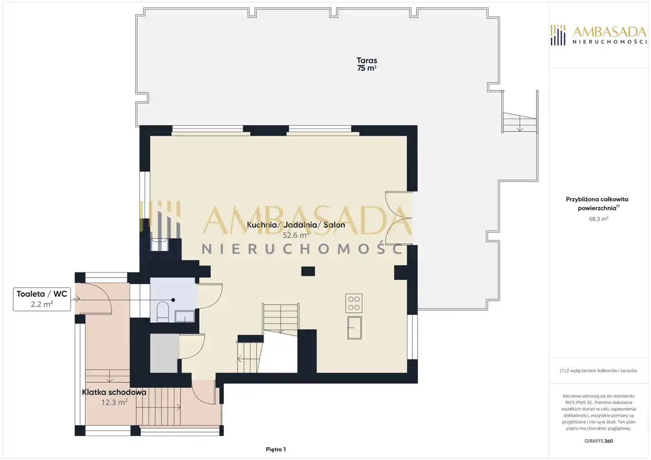 – jasny salon z aneksem kuchennym i jadalnią, wyjście na duży taras, toaleta, pomieszczenie gospodarcze, korytarz.