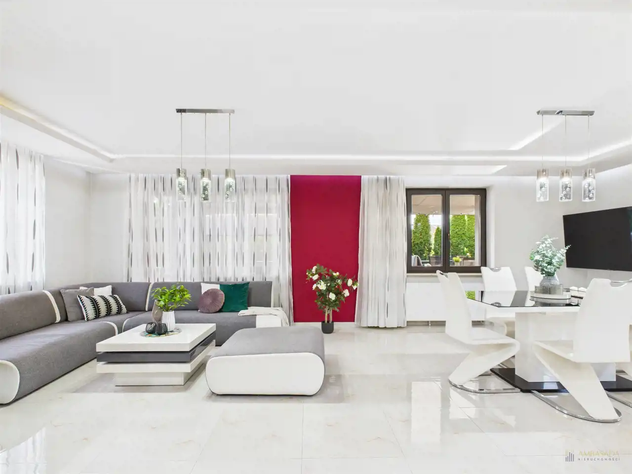 Wnętrza utrzymane są w ciepłym, klasycznym stylu – na podłogach znajduje się drewniana deska, parkiet oraz gres. Ogrzewanie gazowe (piec firmy Viessmann) oraz kominek w salonie, który stanowi dodatkowe źródło ciepła. W kotłowni znajduje się stacja uzdatniania wody (zmiękczacz).
