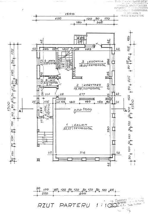 Parter- salon, kuchnia z jadalnią, WC, kotłownia z piecem olejowym,