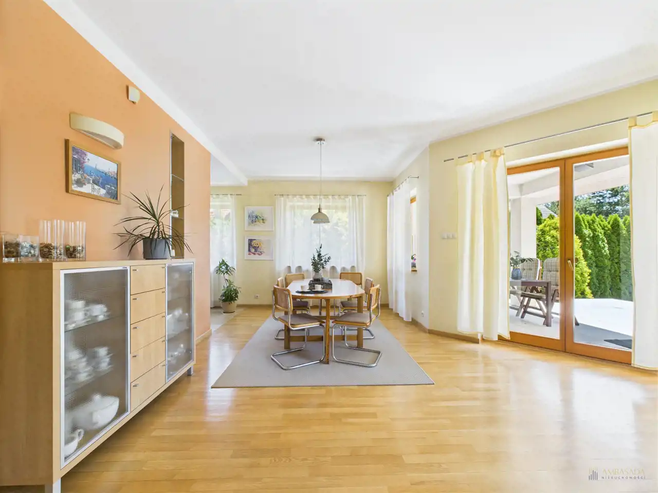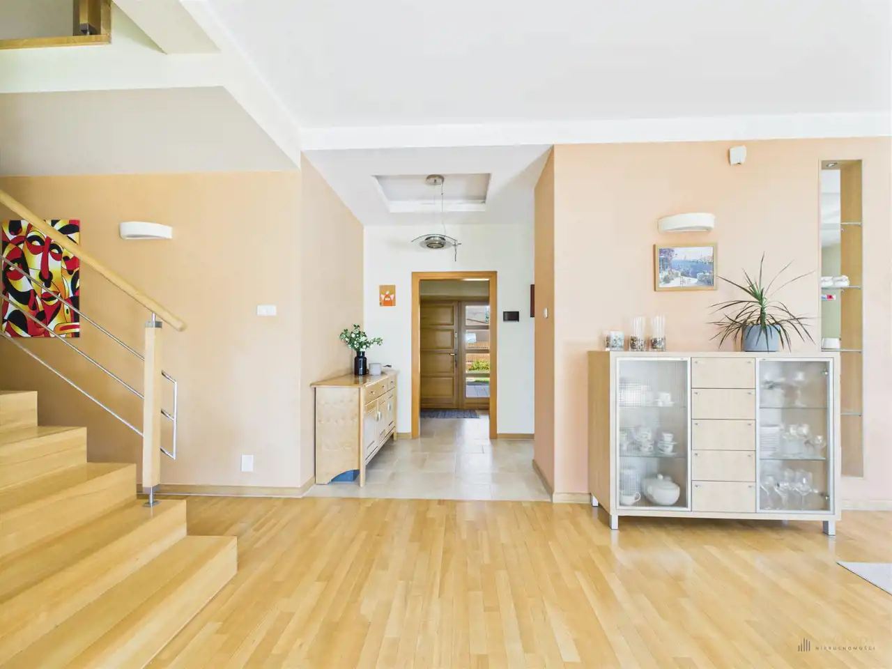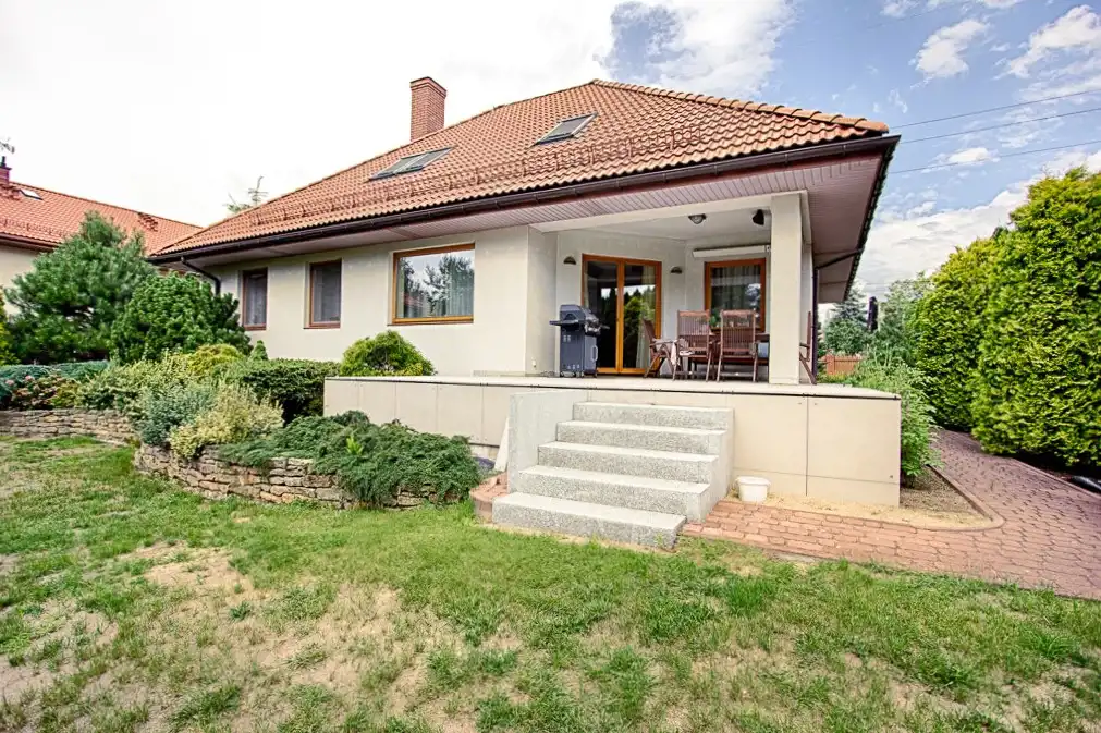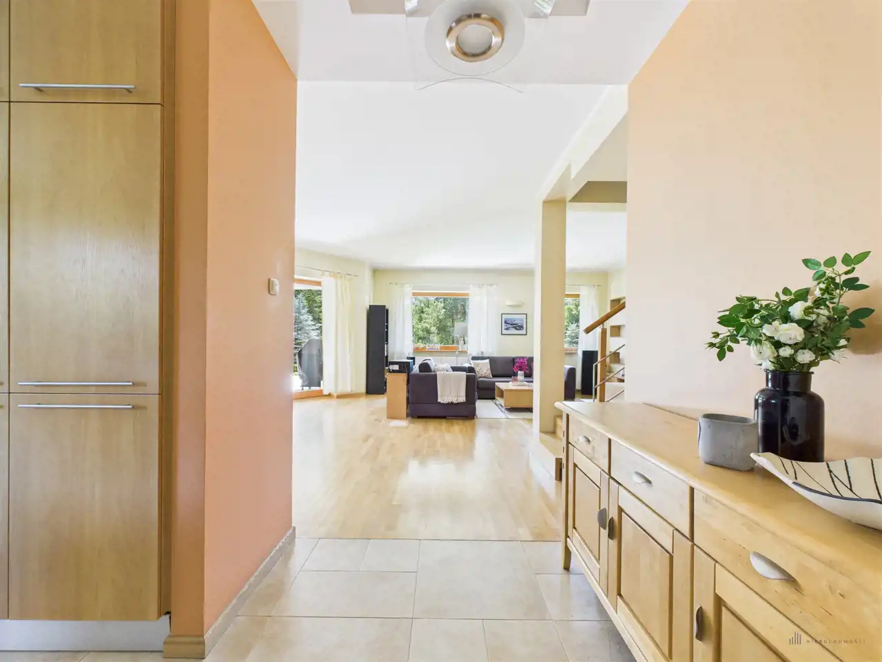 Nieruchomość bardzo zadbana i wykończona w klasycznym stylu solidnymi, naturalnymi materiałami. Na podłogach jesionowy parkiet oraz gres, schody drewniane (jesion), wszystkie zabudowy wykonane na zamówienie. Dodatkowym atutem jest kamienny kominek w salonie idealny na chłodniejsze dni oraz zadaszony taras z widokiem na ogród. Dodatkowe miejsce relaksu to wykonana z cedru sauna na 4-5 osób znajdująca się w głównej łazience na półpiętrze.