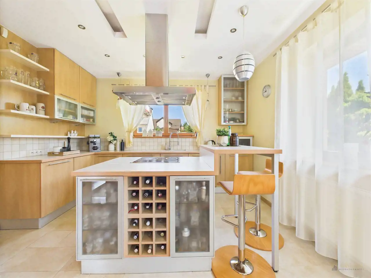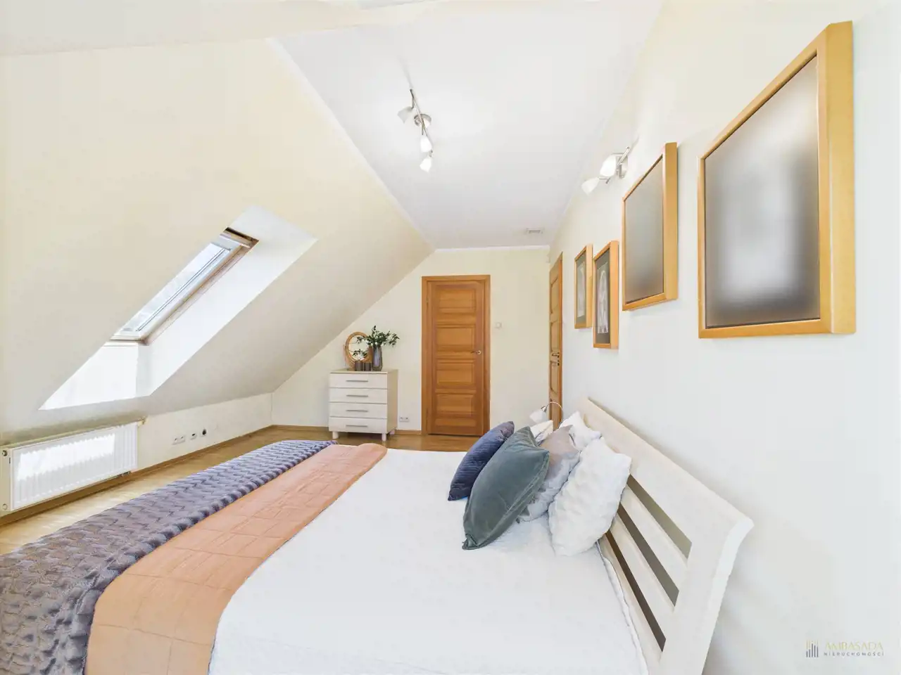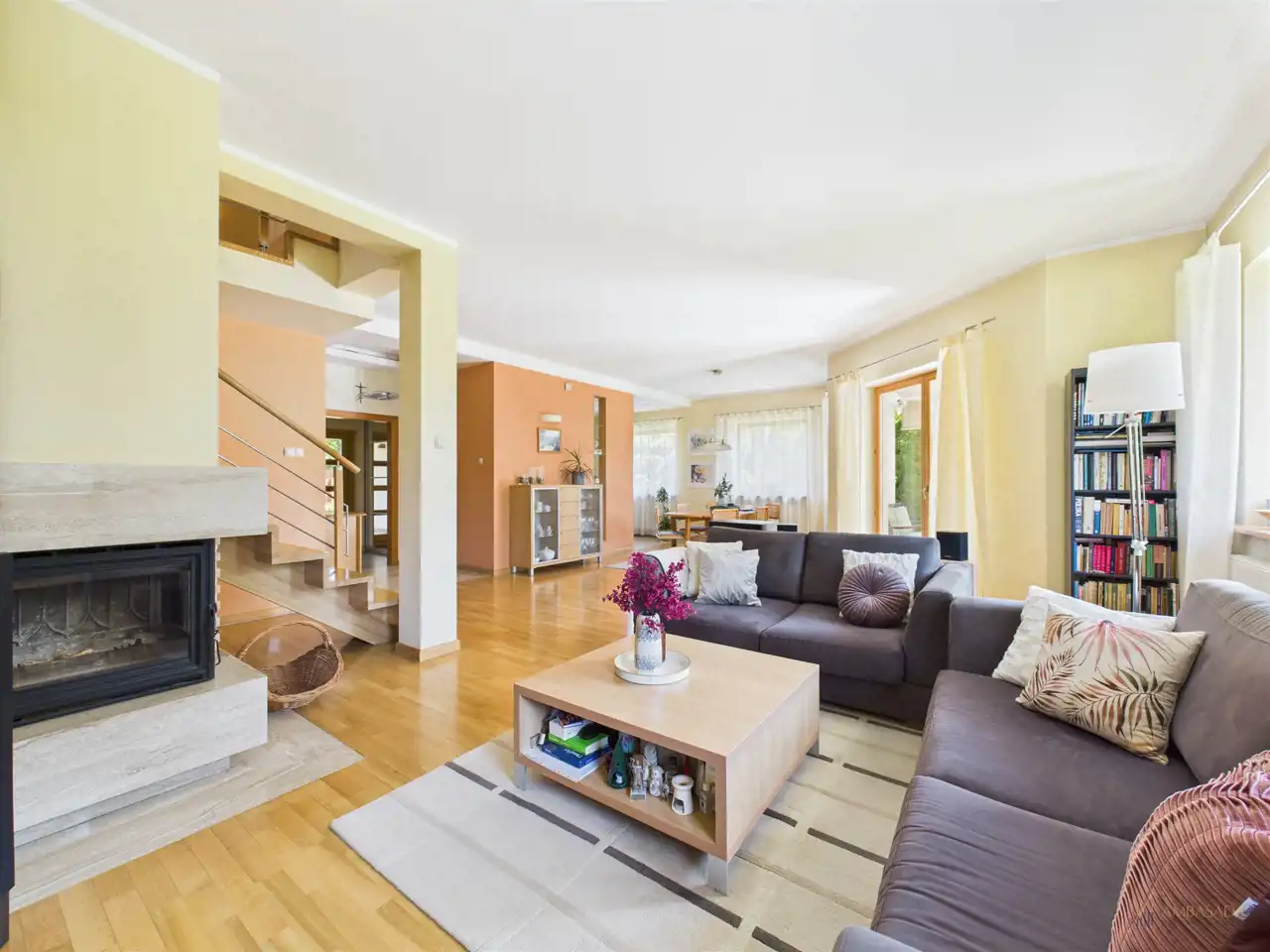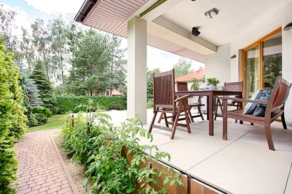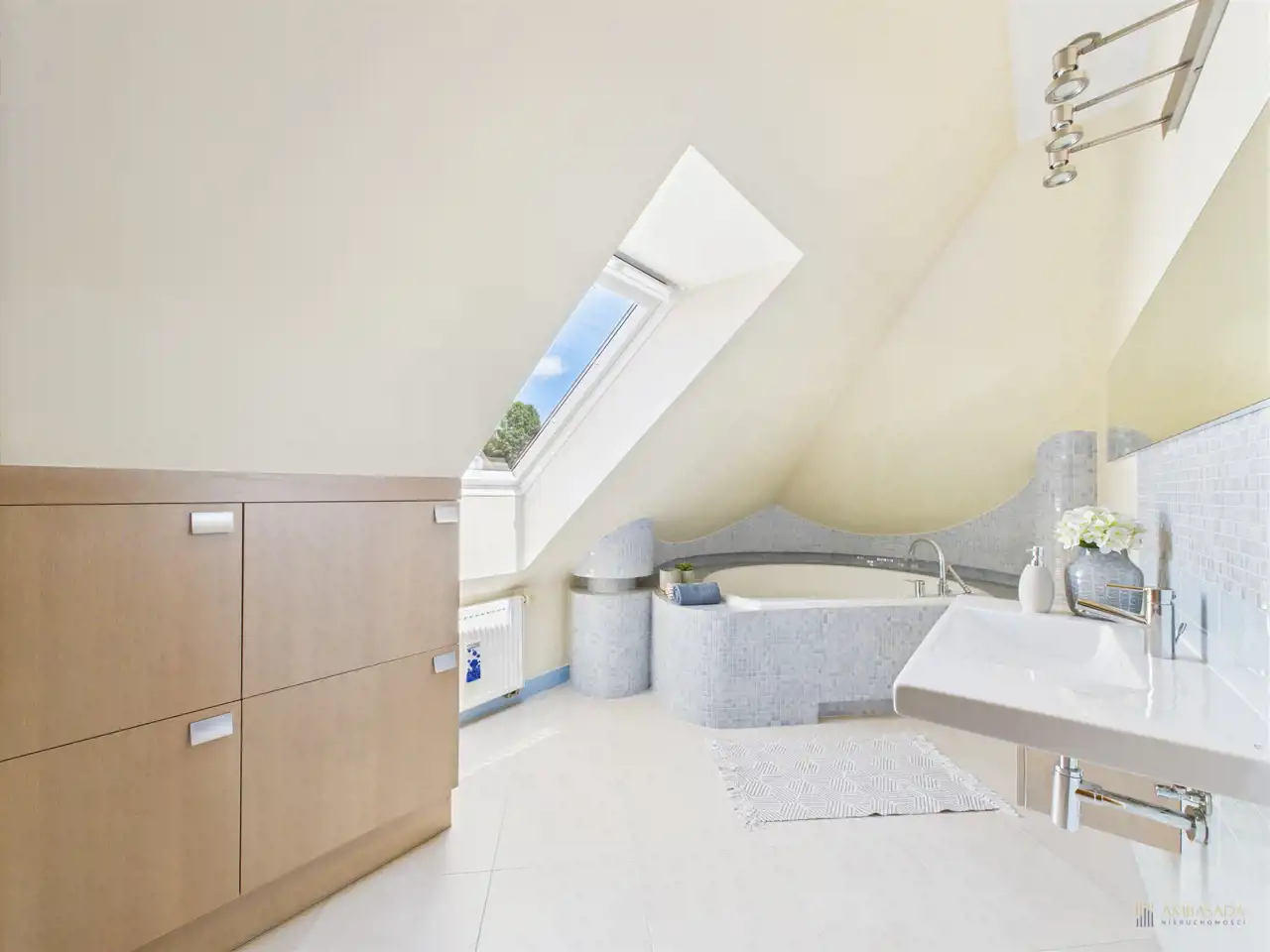 Nieruchomość bardzo zadbana i wykończona w klasycznym stylu solidnymi, naturalnymi materiałami. Na podłogach jesionowy parkiet oraz gres, schody drewniane (jesion), wszystkie zabudowy wykonane na zamówienie. Dodatkowym atutem jest kamienny kominek w salonie idealny na chłodniejsze dni oraz zadaszony taras z widokiem na ogród. Dodatkowe miejsce relaksu to wykonana z cedru sauna na 4-5 osób znajdująca się w głównej łazience na półpiętrze.