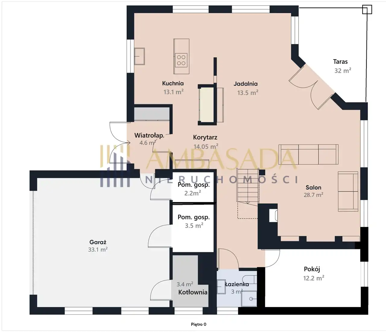 - wiatrołap (4,6 m2) oraz korytarz (4,95 m2) z możliwością organizacji oddzielnej garderoby w sąsiadującym pomieszczeniu gospodarczym (2,2 m2)