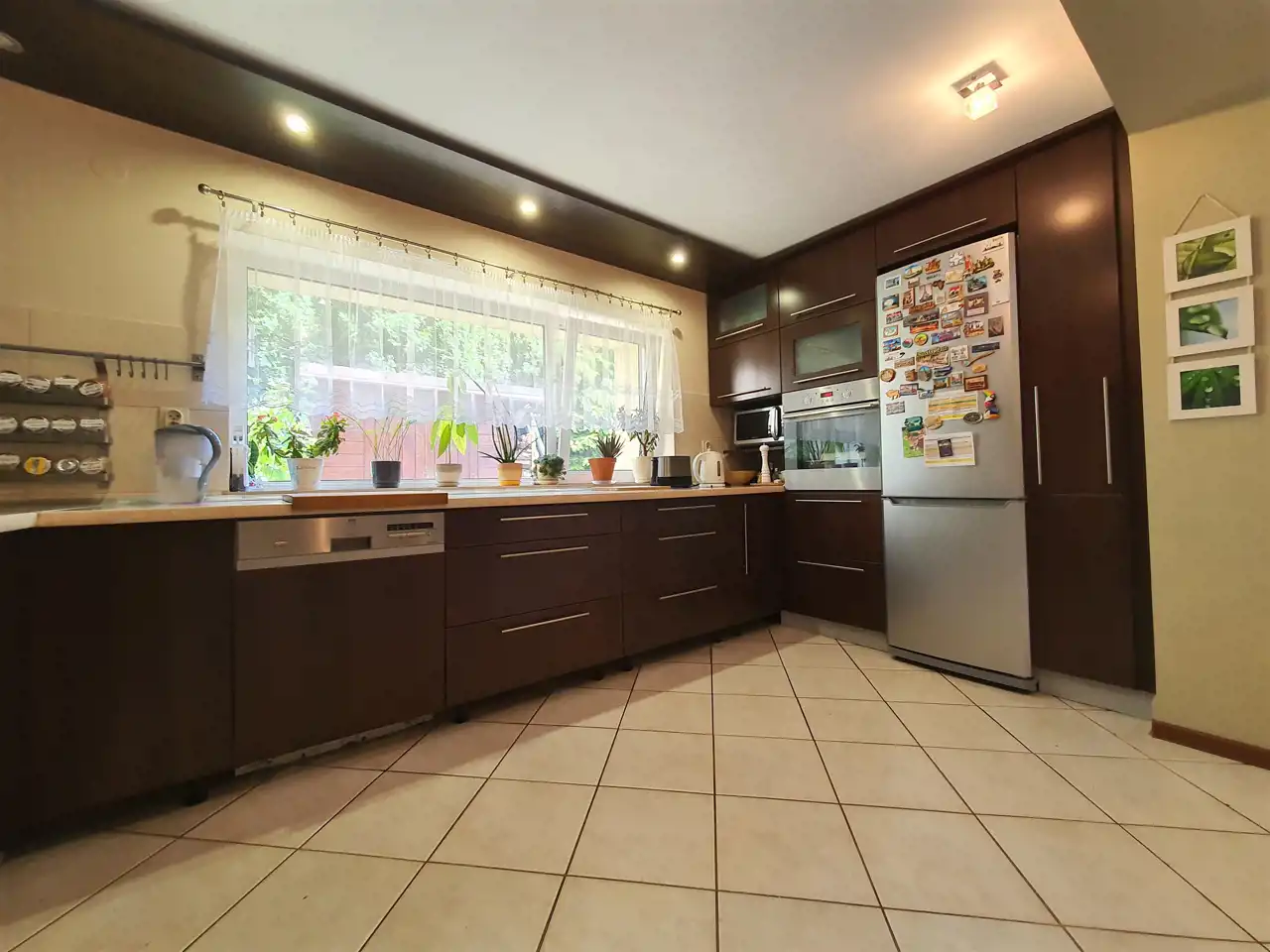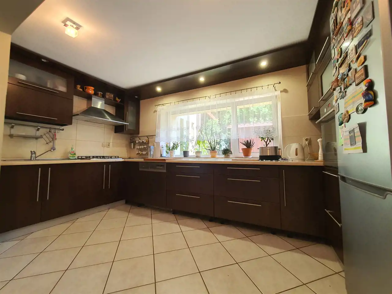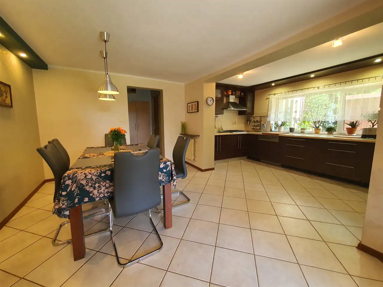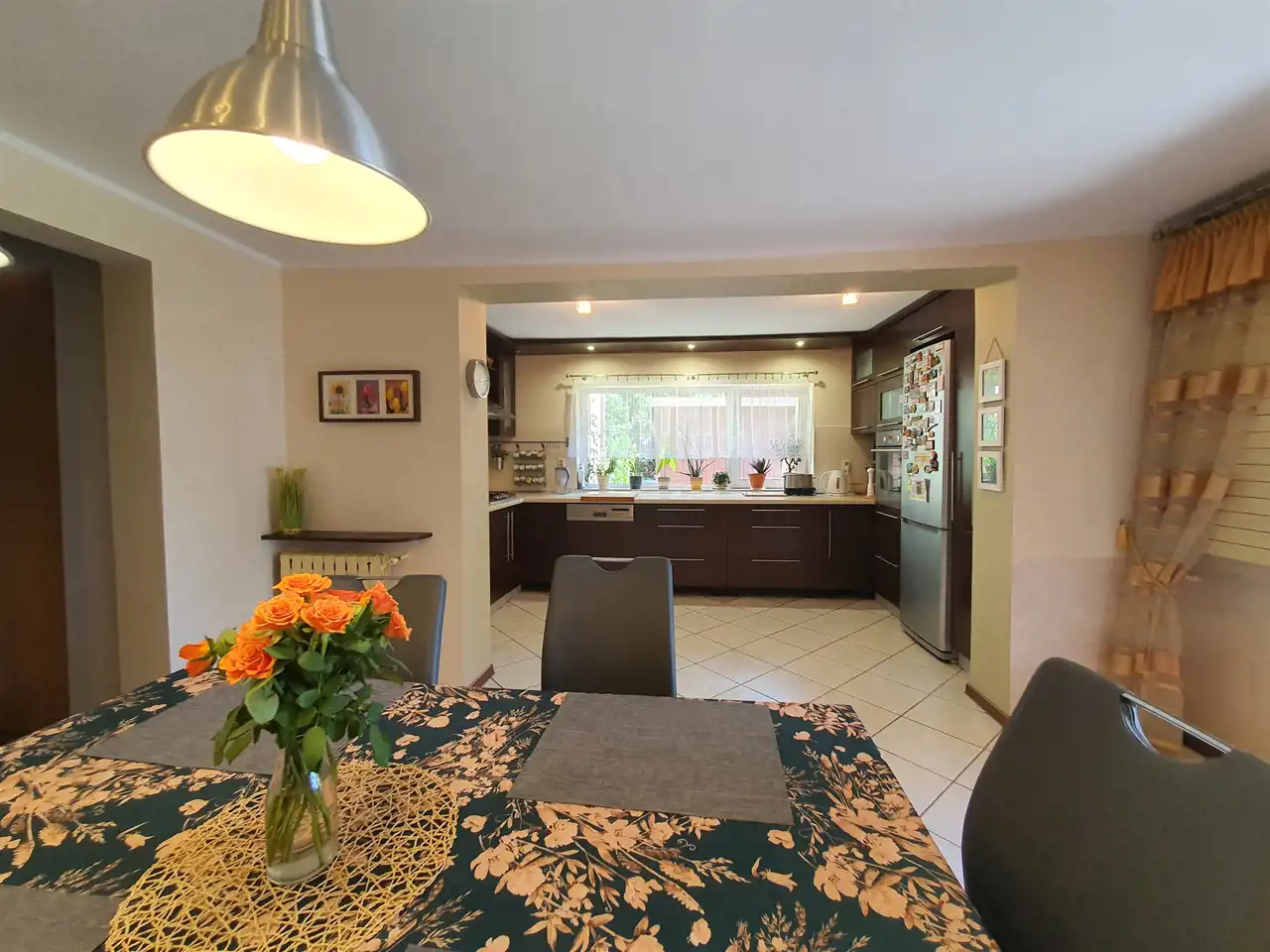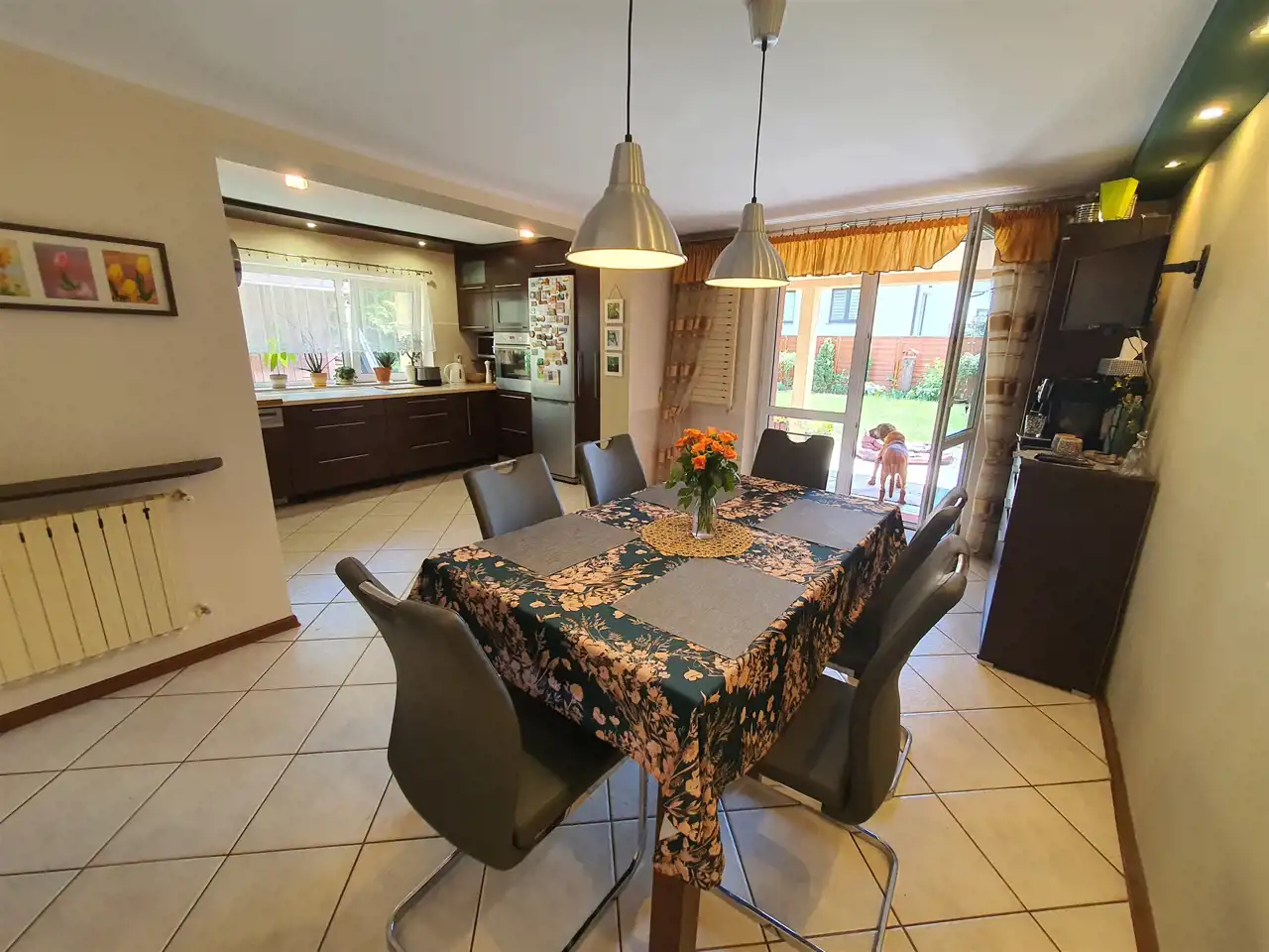 - duża, wygodna i funkcjonalna kuchnia połączona z jadalnią (ok. 24,4m2) z bezpośrednim wyjściem do ogrodu - sprzyjająca wspólnym posiłkom i biesiadowaniu, w chłodne dni wewnątrz, a latem na zadaszonym tarasie lub w ogrodzie. Kuchnia doskonale doświetlona, z elegancką zabudową z licznymi szafkami oraz sprzętem AGD: lodówka Samsung, zmywarka AEG 60cm, piekarnik Elektrolux, płyta gazowa 60cm, duży okap 90cm.