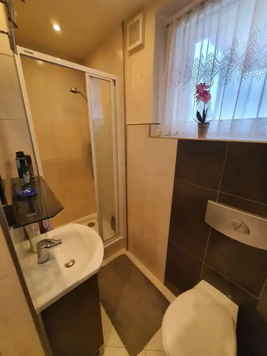 - łazienka z prysznicem, umywalką i WC