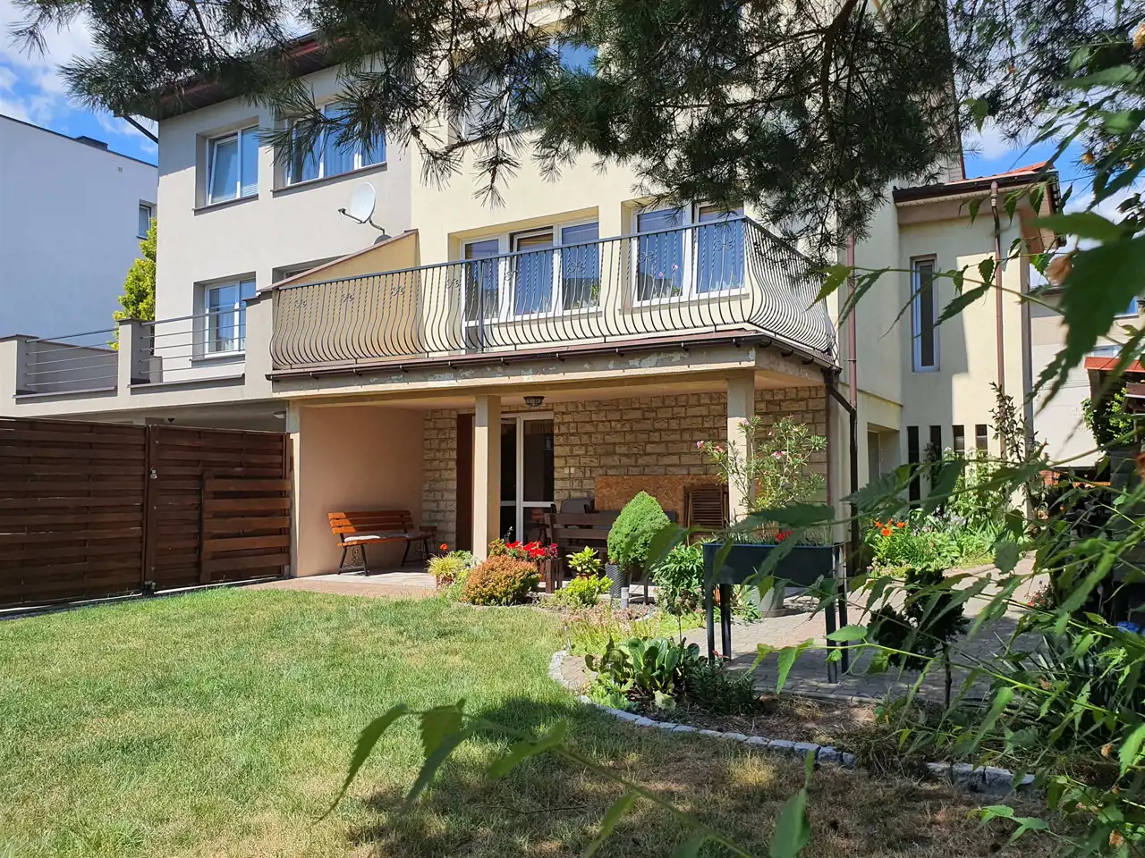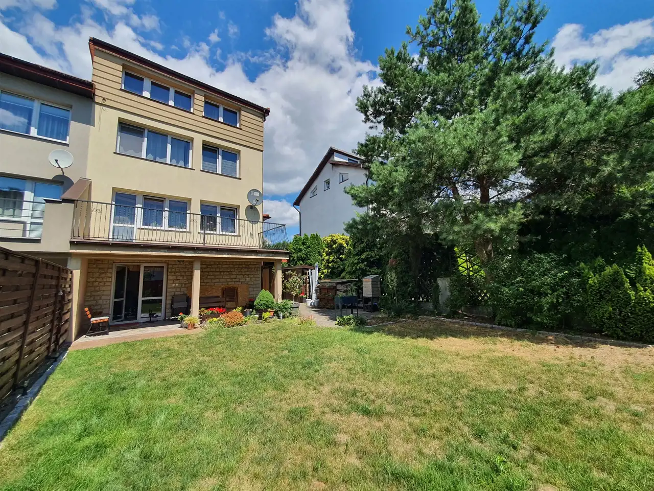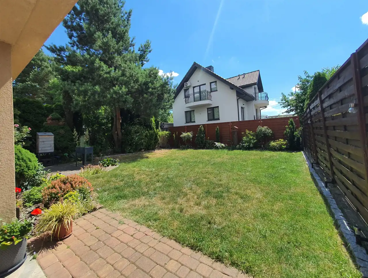 Ogrodzenie posesji: od frontu klinkier + drewno, od strony ogrodu ogrodzenie mieszane: siatka i panele drewniane. Wszystkie drewniane elementy ogrodzenia świeżo odmalowane!