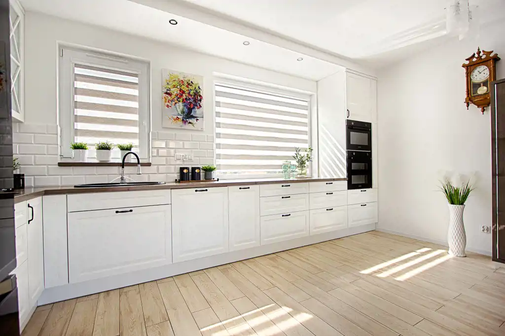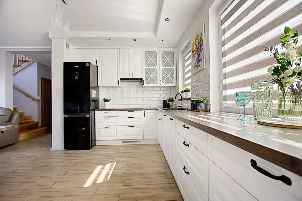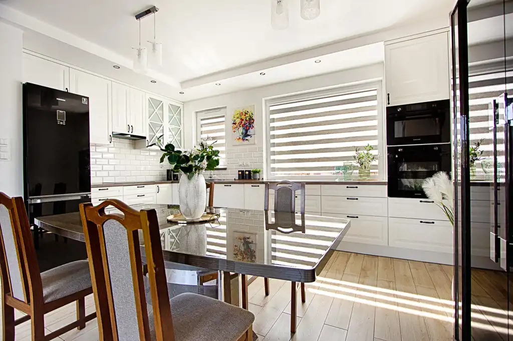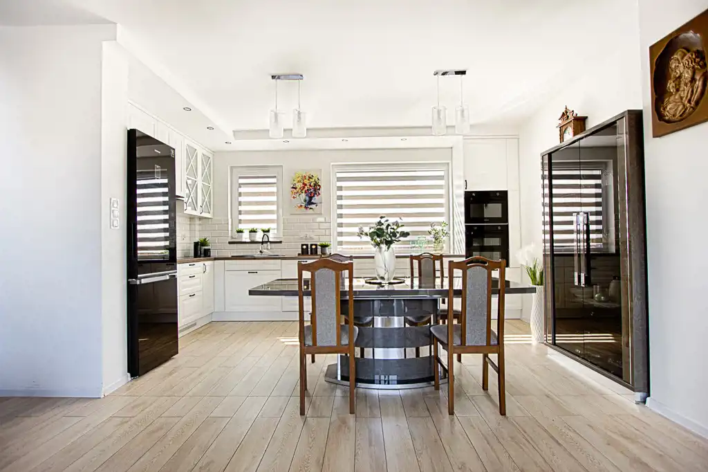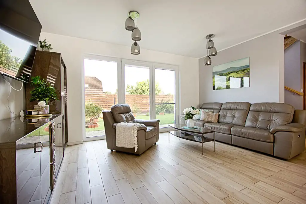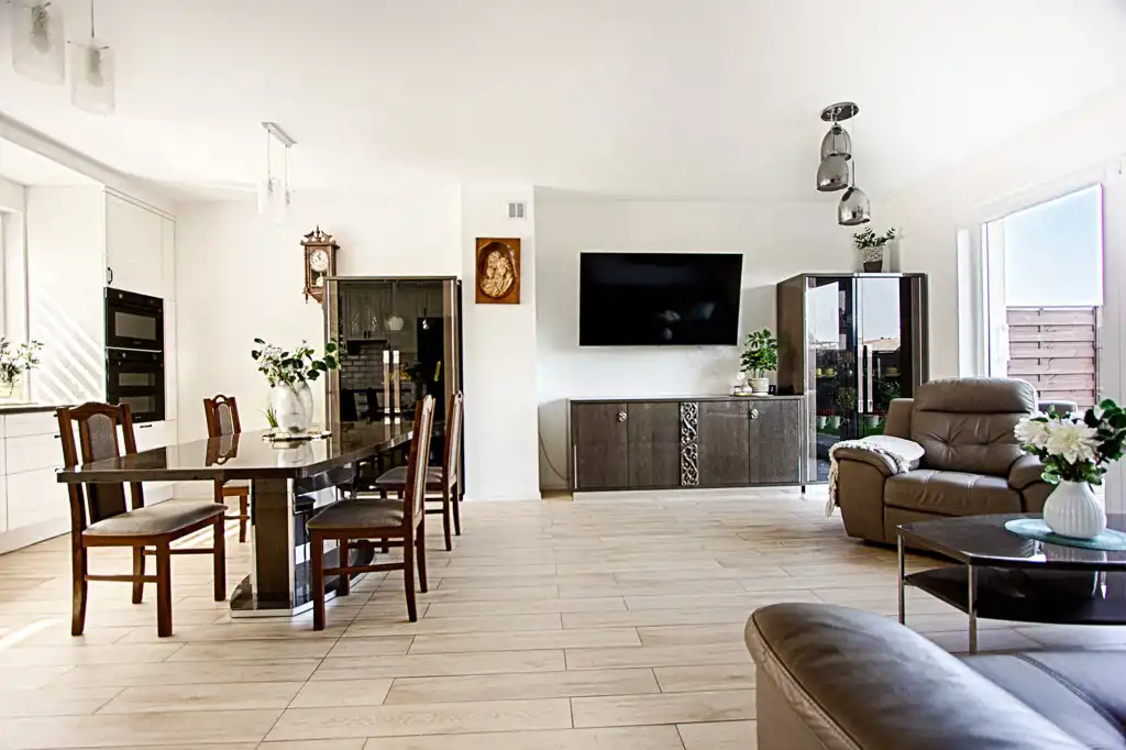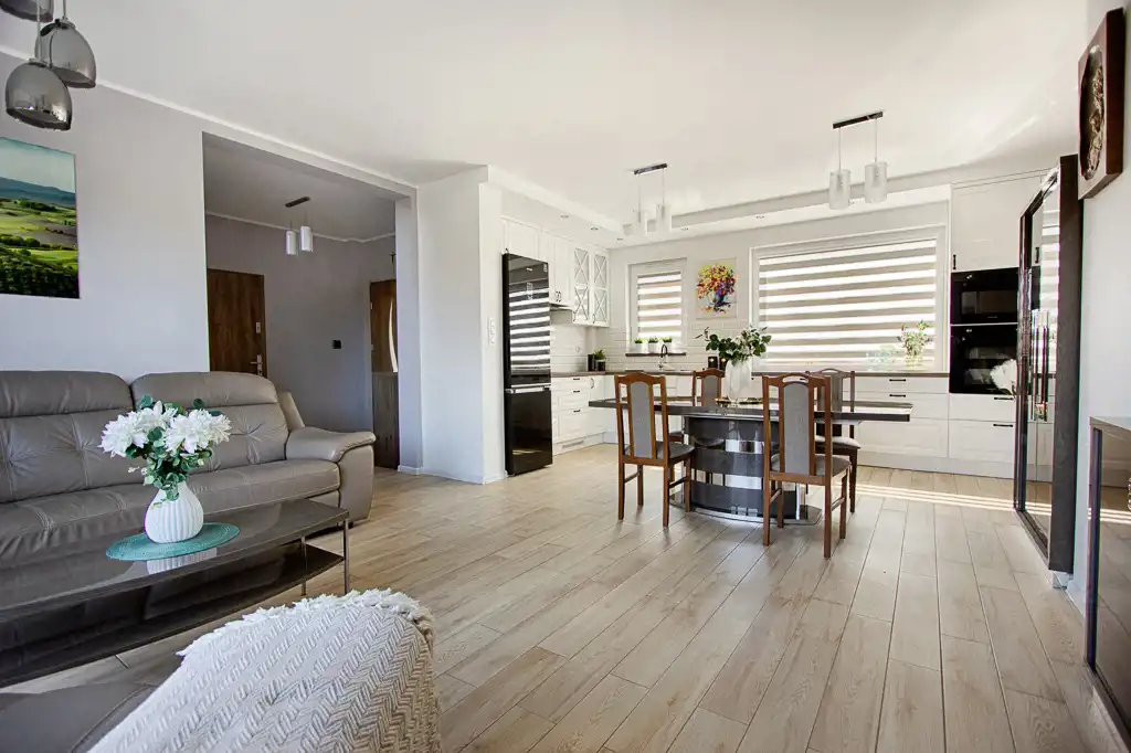 Centralnym punktem domu jest otwarty pokój dzienny (z wyjściem na ogród), który wraz z kuchnią i jadalnią tworzy gustowne wnętrze. Na uwagę zasługuje duża urządzona kuchnia, wyposażona w profesjonalny sprzęt tj. piekarnik, mikrofalówka, zmywarka , lodówka, płyta indukcyjna. Zdecydowanie miejsce dla tych, którzy lubią gotować. Dzięki dużej ilości okien przestrzeń dzienna jest bardzo doświetlona.