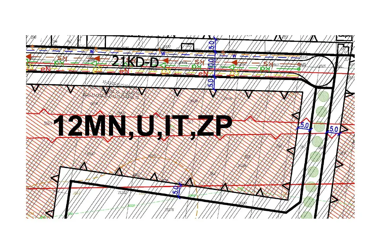 Przeznaczenie w MPZP: Teren 12MN,U,IT,ZP – zabudowa mieszkaniowa jednorodzinna, usługowa, infrastruktura techniczna oraz zieleń urządzona