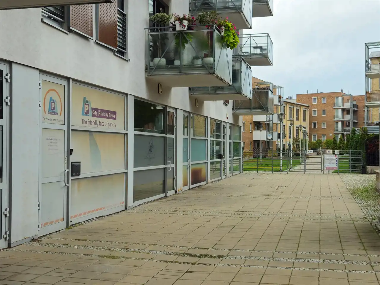 Lokal położony jest na wysokim parterze w strefie komunikacyjnej do osiedla mieszkaniowego. Posiada dużą witrynę oraz reprezentacyjne, przeszklone drzwi. Budynek w części usługowej wyposażony jest w windę, która umożliwia komunikację osobom z niepełnosprawnościami.