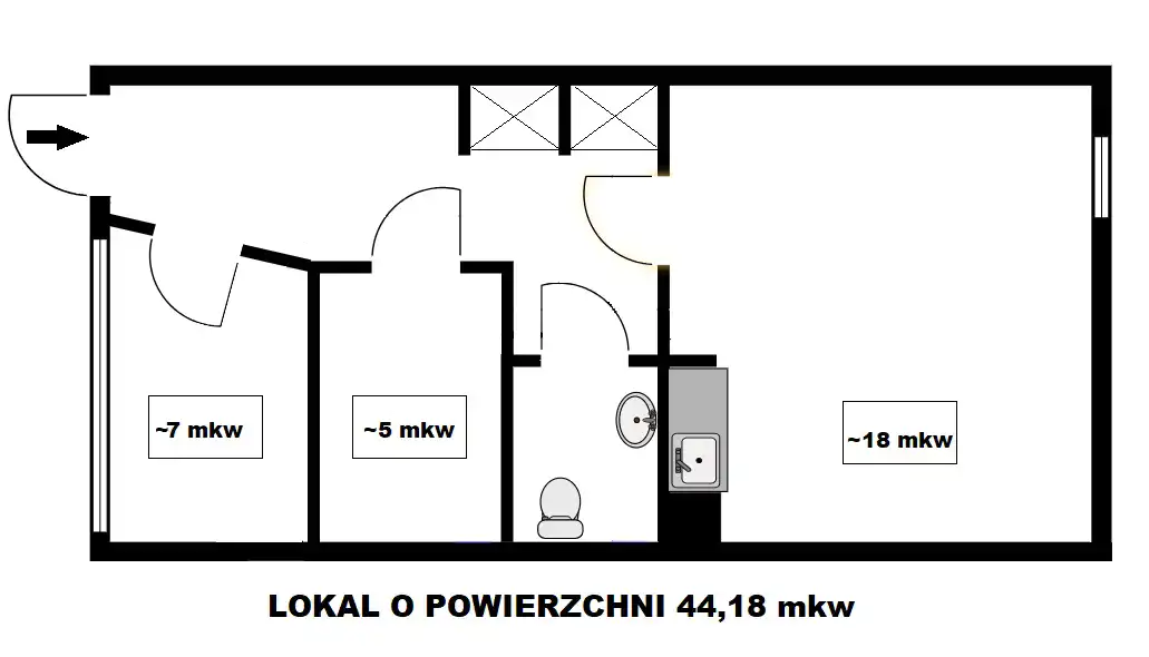 Do sprzedaży lokal stanowiący odrębną własność położony na parterze budynku wielomieszkaniowego. Powierzchnia lokalu wynosi 44,18 m2. Na jego powierzchni znajdują się: korytarz, 3 pomieszczenia (w tym jedno bez okien), toaleta.