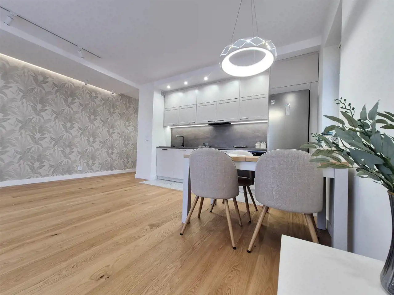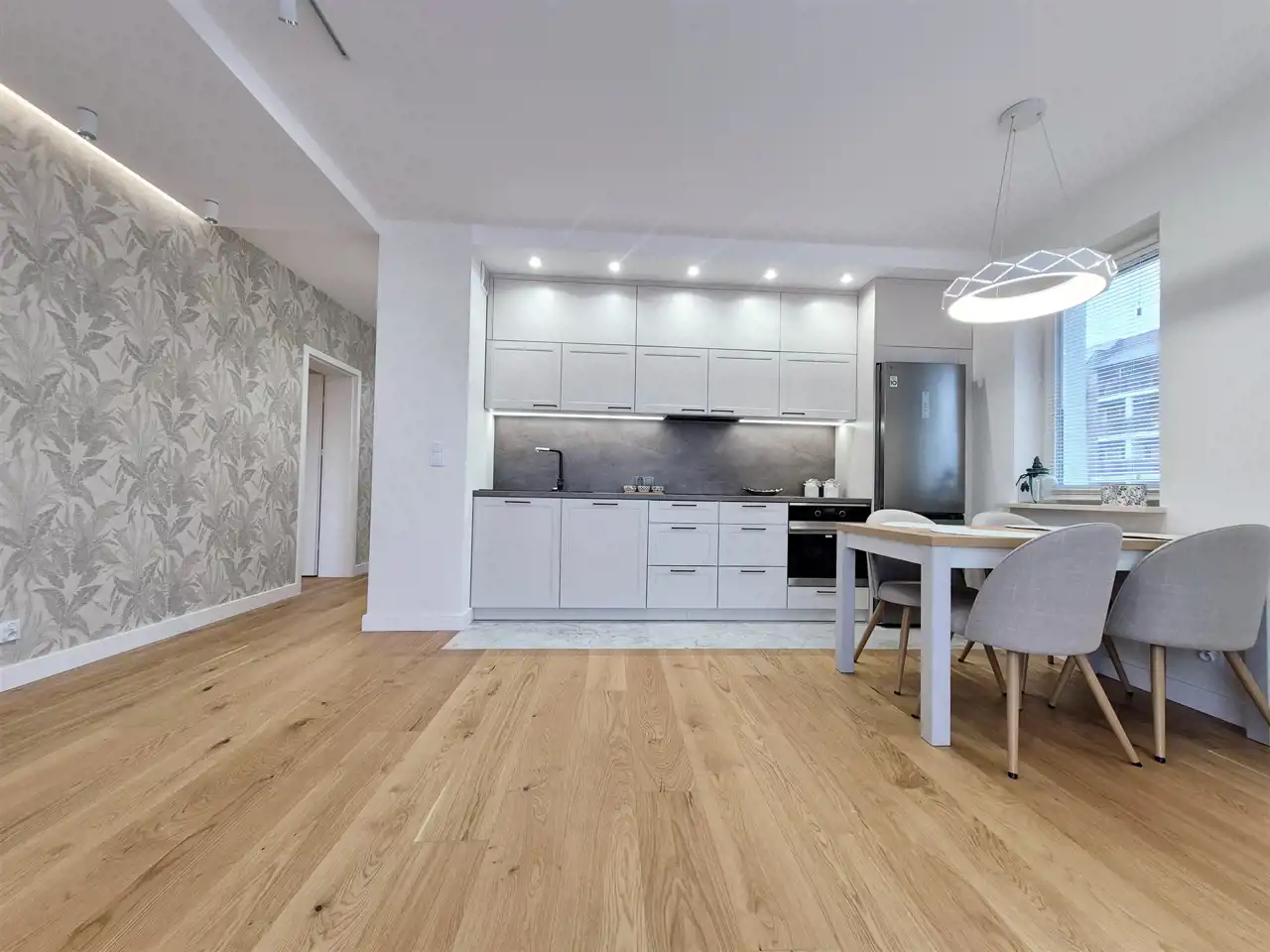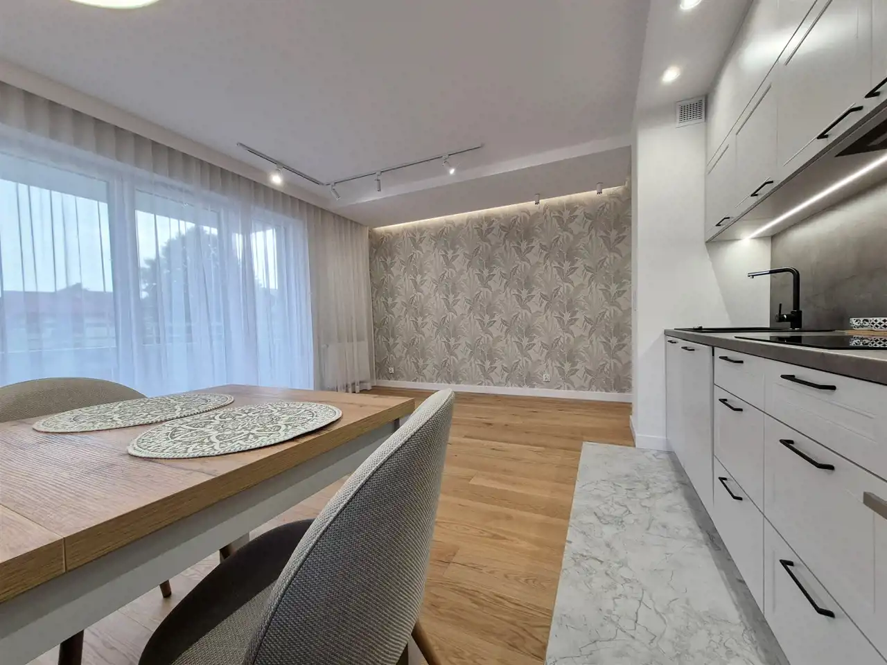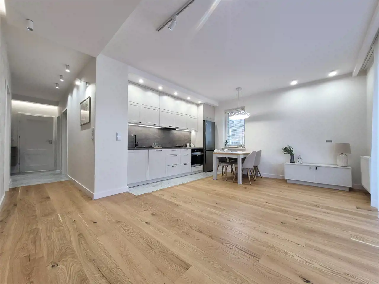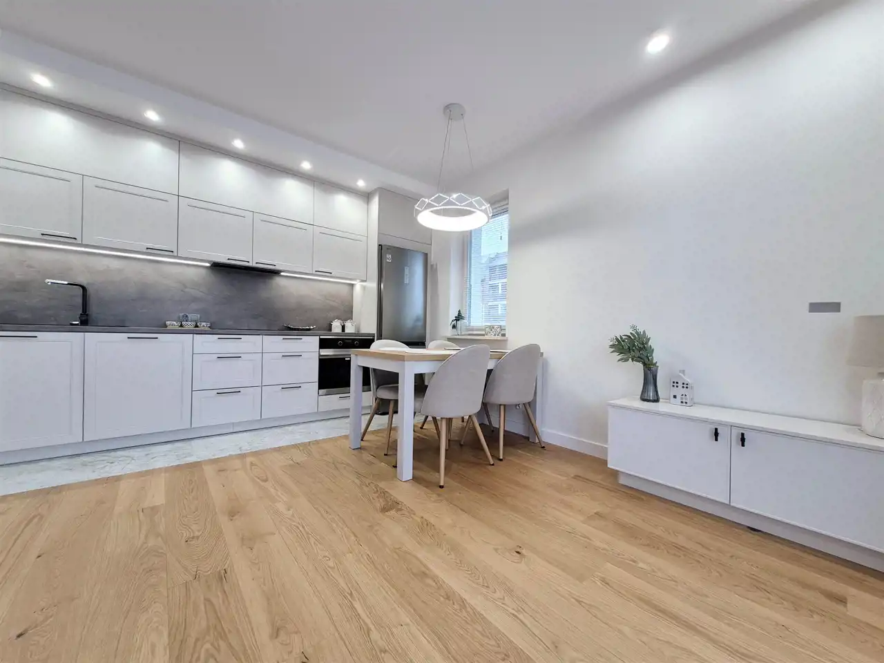Salon z aneksem kuchennym – przestronny, słoneczny, z wyjściem na narożny balkon. Aneks wyposażony w nowoczesną zabudowę meblową i wysokiej klasy sprzęt AGD (zmywarka, płyta indukcyjna, piekarnik, lodówka).