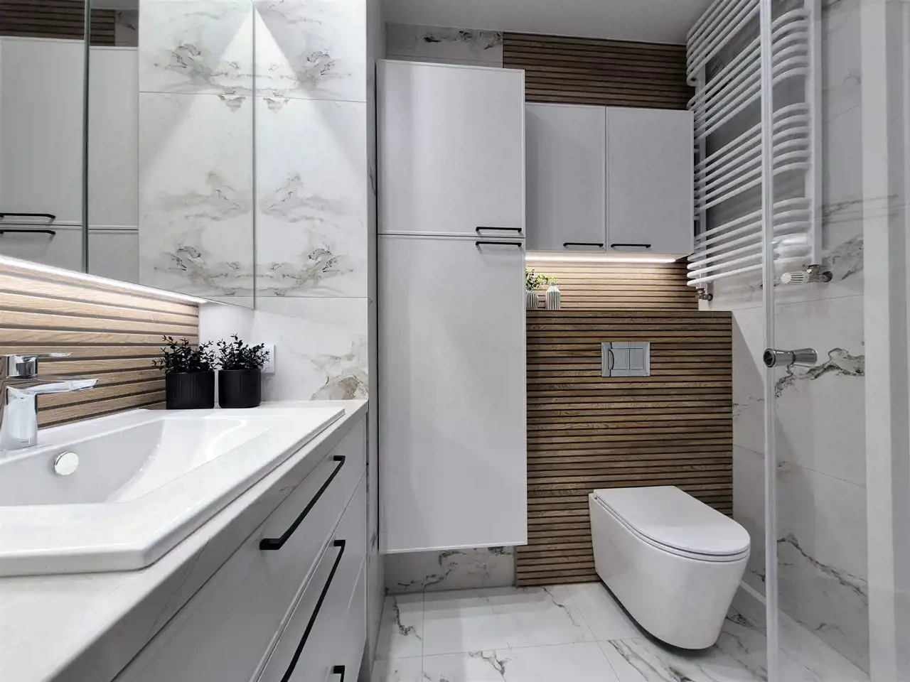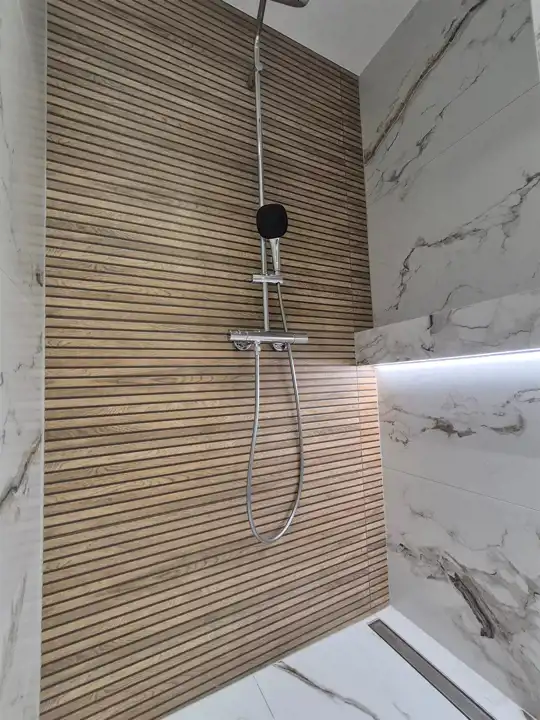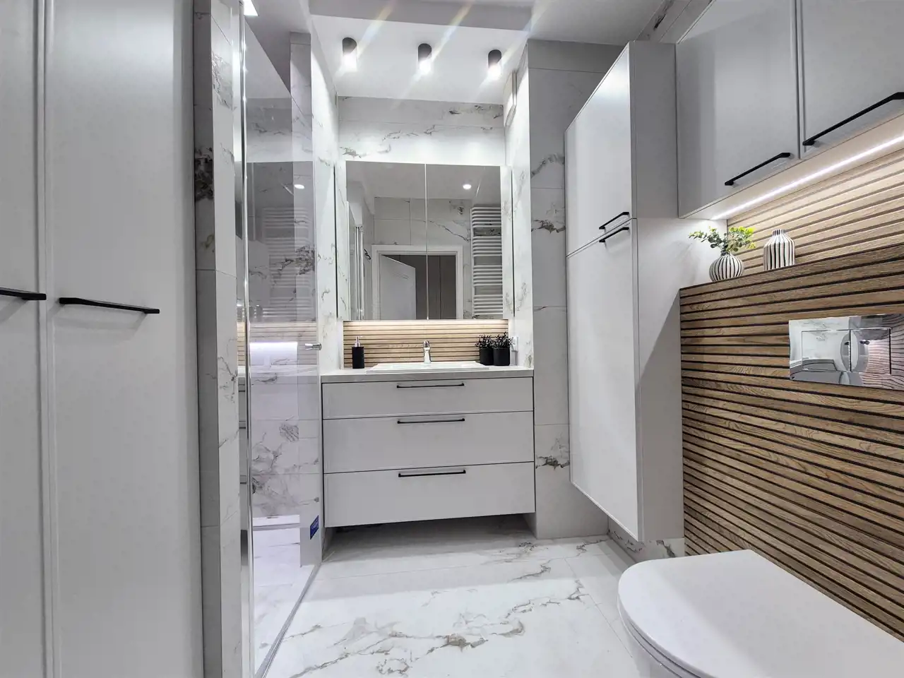 Łazienka – elegancka, z dużym prysznicem, wykończona w jasnych tonacjach.
