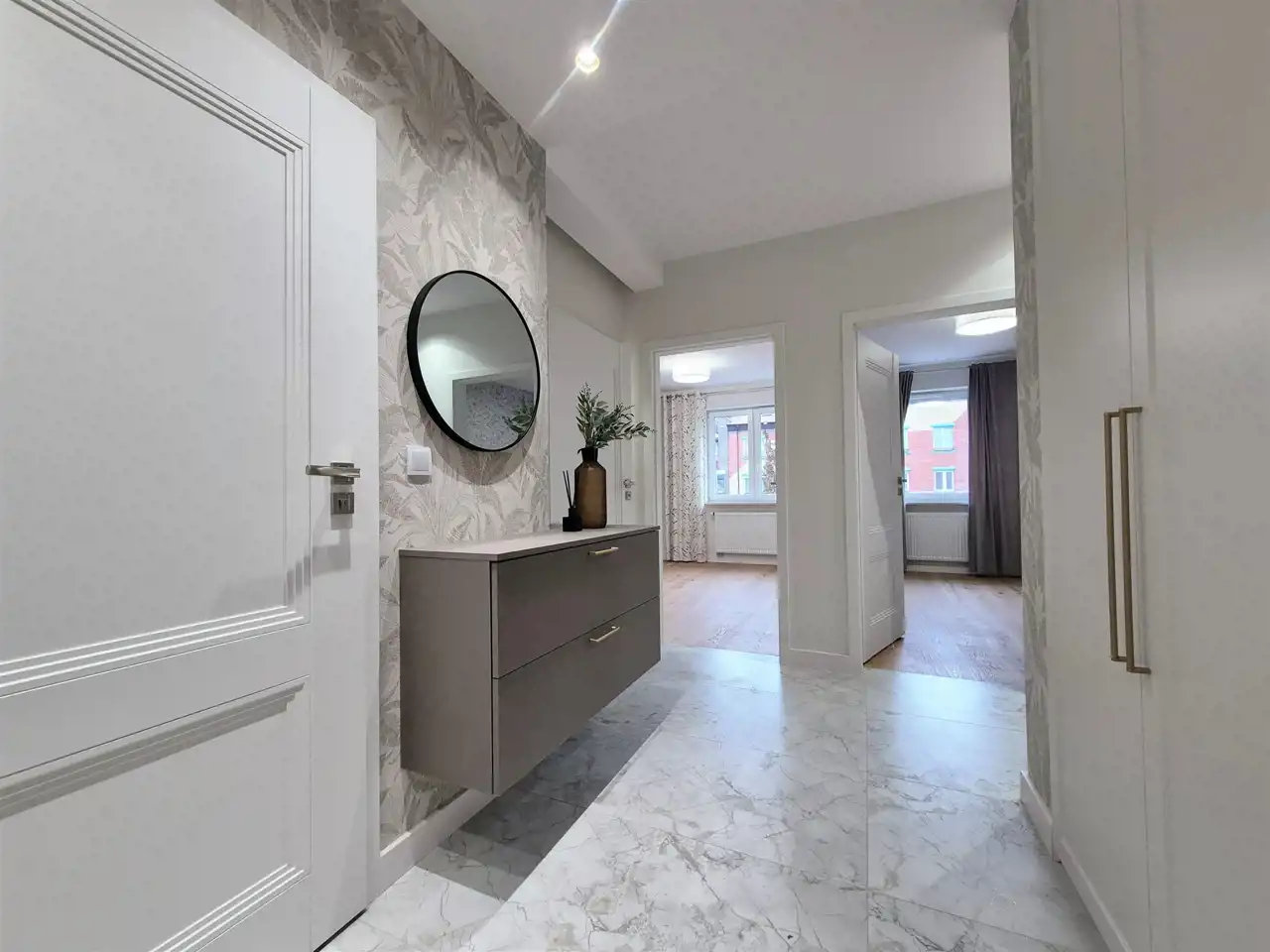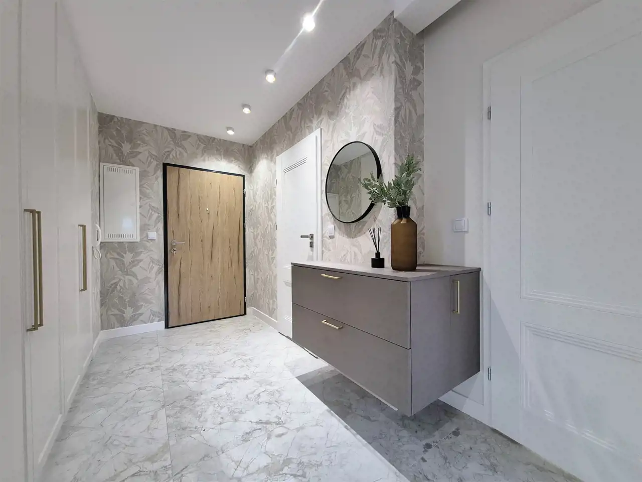 Przedpokój – wyposażony w zabudowę szaf wnękowych z automatycznym systemem Led oraz elegancką komodą