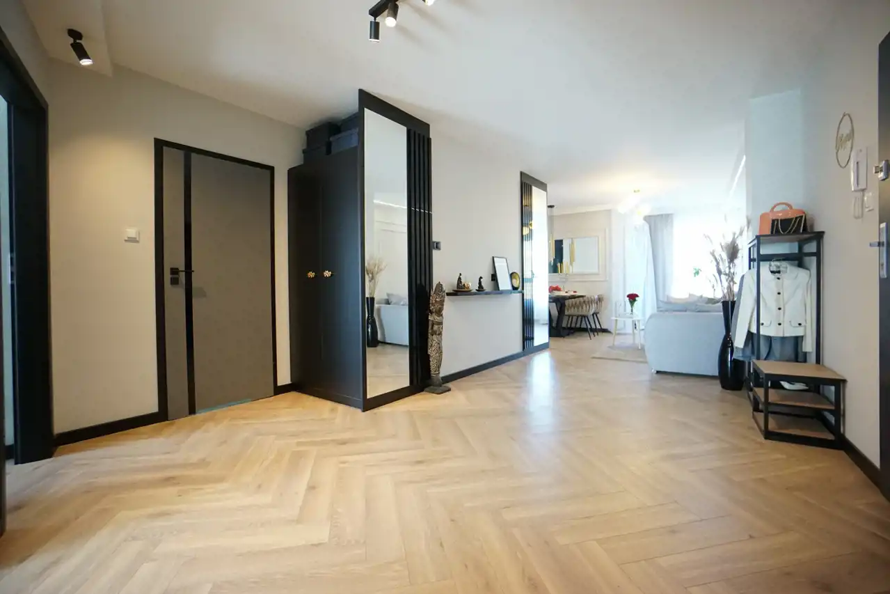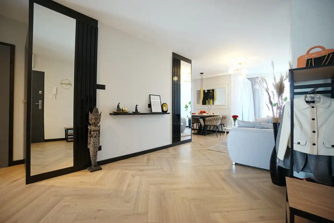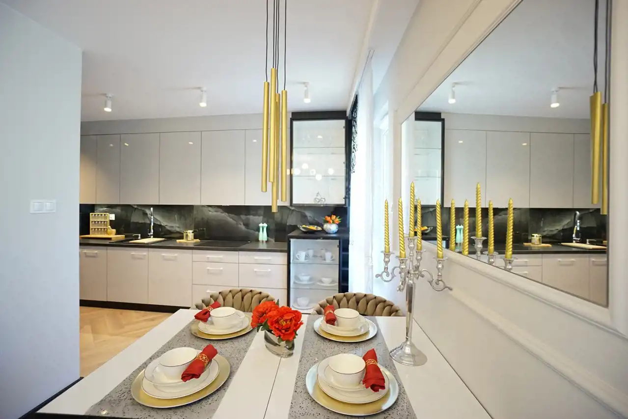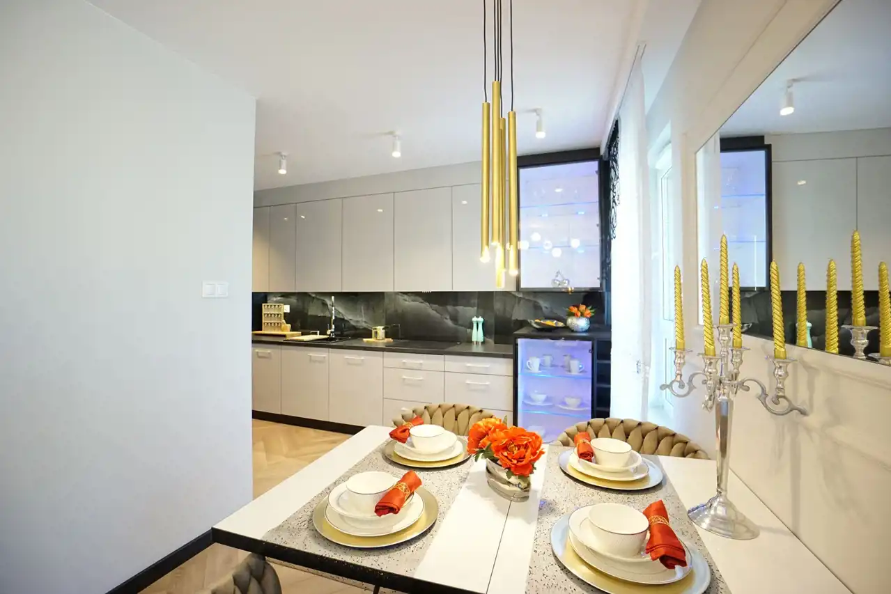 - salon połączony z jadalnią i otwartą kuchnią - stanowi serce mieszkania, tworząc przyjemną przestrzeń do wspólnych spotkań. Praktyczna spiżarnia pozwala na przechowywanie zapasów oraz utrzymanie porządku. W kuchni nowoczesna, wysokiej jakości zabudowa wraz ze sprzętem AGD (lodówka, zamrażarka, piekarnik, płyta indukcyjna, okap, zmywarka). W salonie wygodna kanapa.