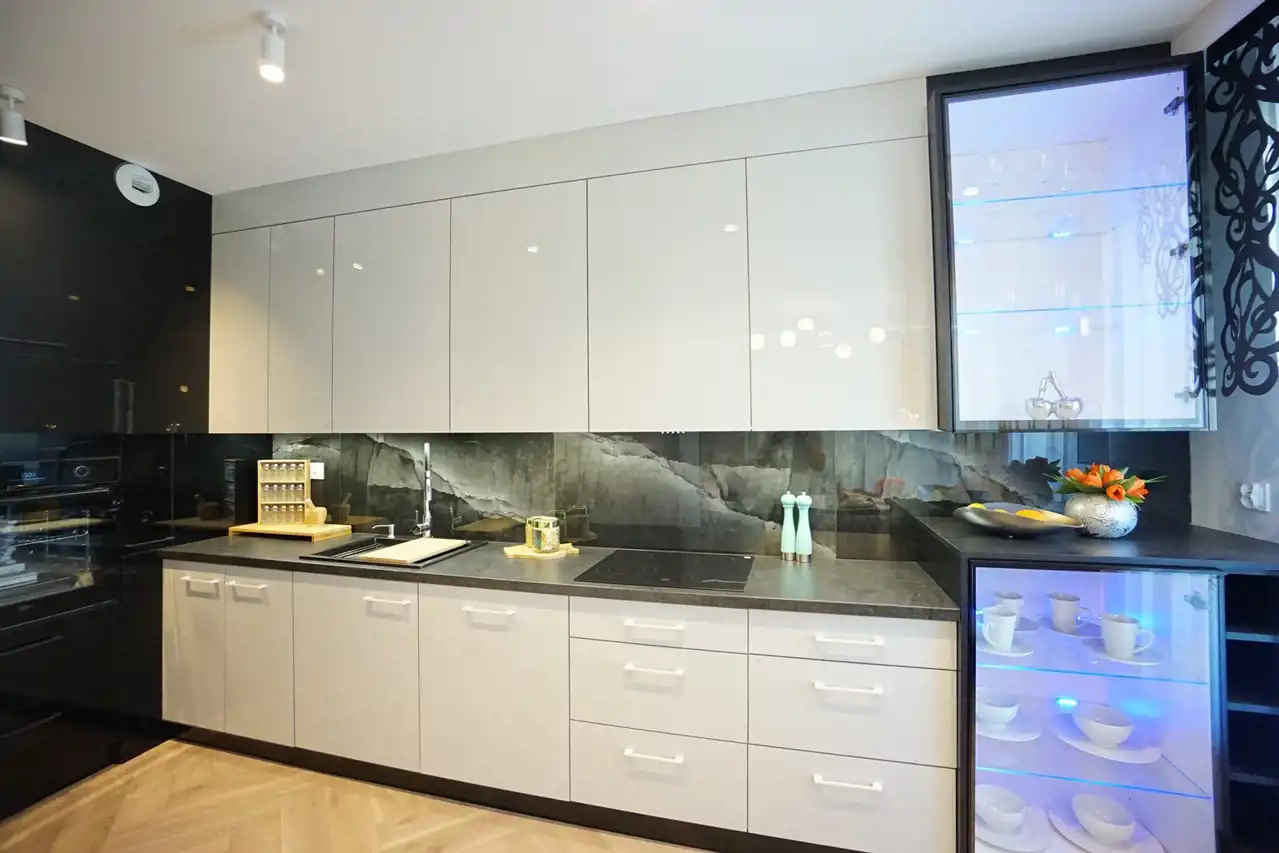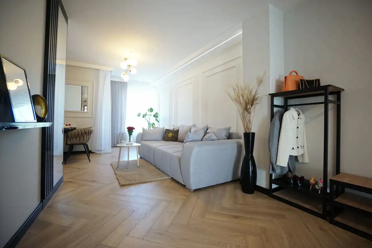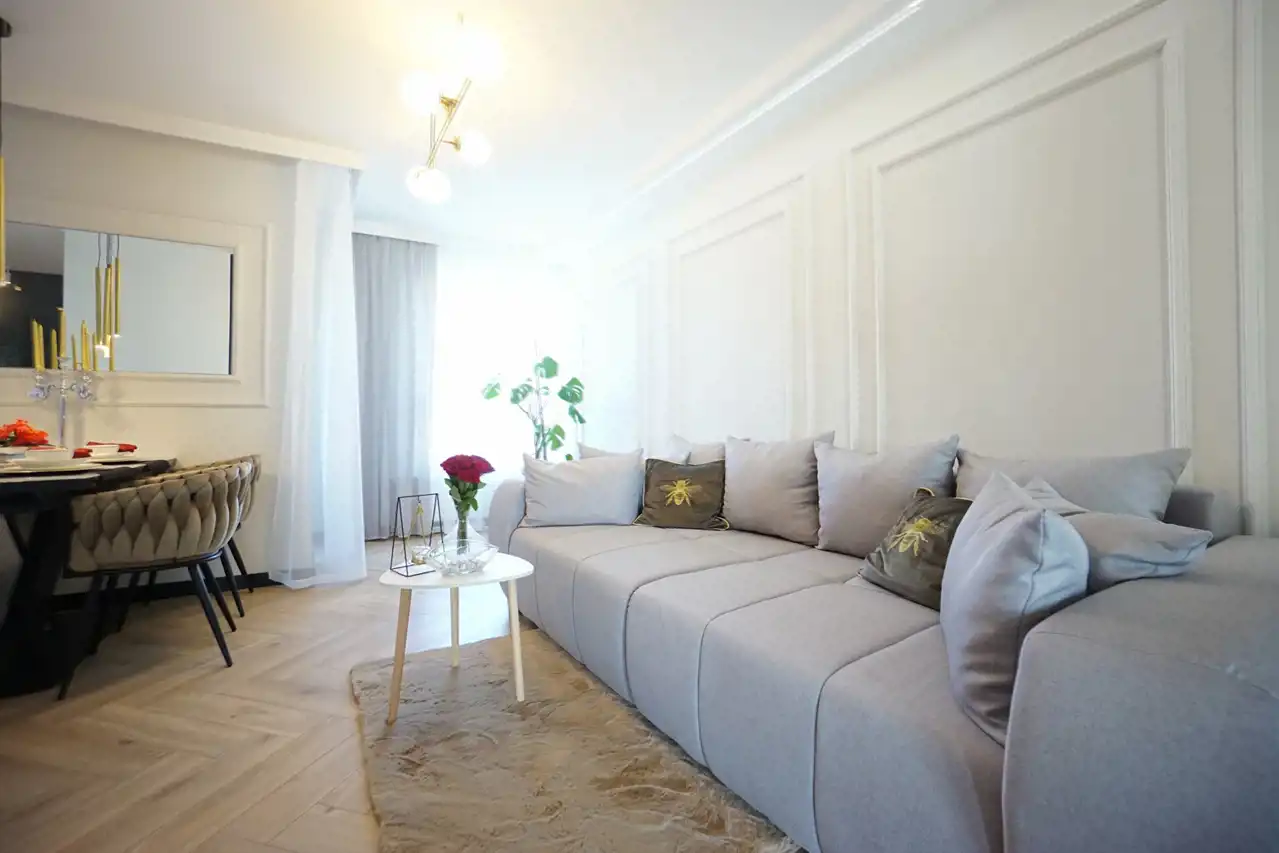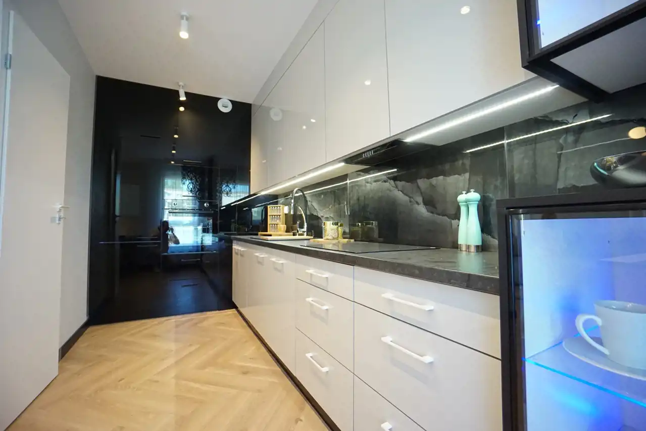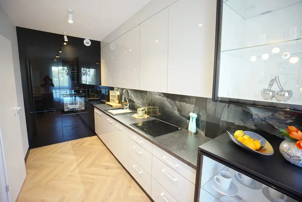 - salon połączony z jadalnią i otwartą kuchnią - stanowi serce mieszkania, tworząc przyjemną przestrzeń do wspólnych spotkań. Praktyczna spiżarnia pozwala na przechowywanie zapasów oraz utrzymanie porządku. W kuchni nowoczesna, wysokiej jakości zabudowa wraz ze sprzętem AGD (lodówka, zamrażarka, piekarnik, płyta indukcyjna, okap, zmywarka). W salonie wygodna kanapa.