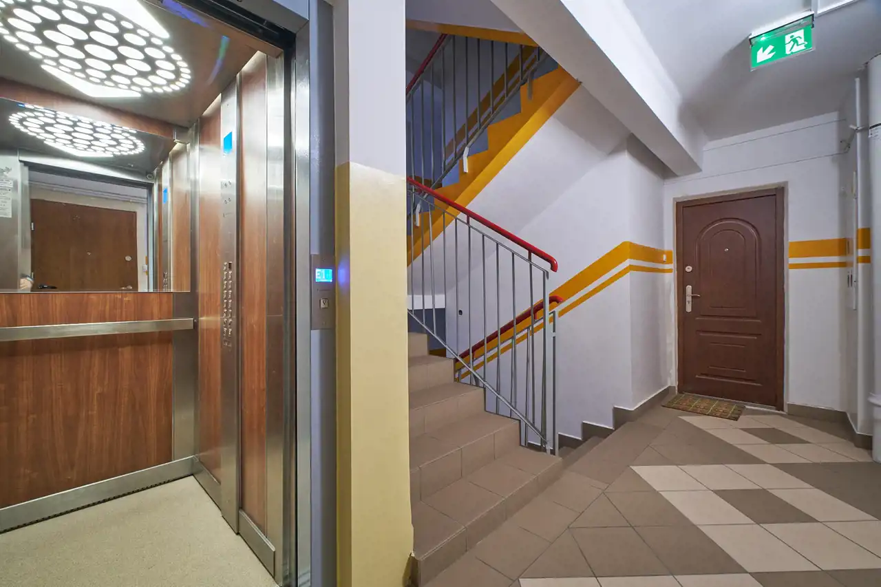 Zadbany wieżowiec po termomodernizacji, klatka schodowa po remoncie. Nowa winda.