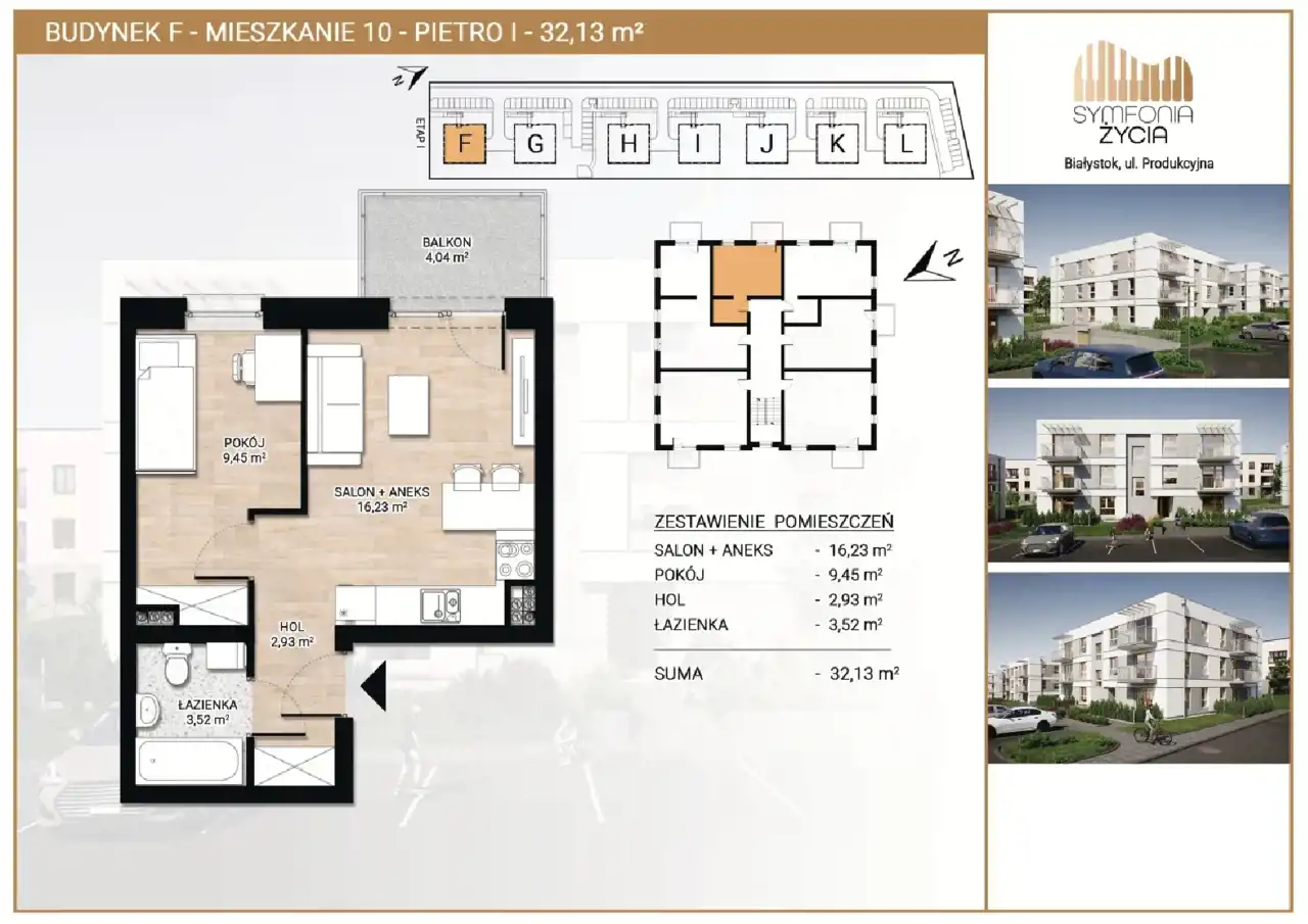 Oferujemy mieszkanie 2- pokojowe nr F10 o powierzchni 32,30m2 zlokalizowane na I piętrze w kameralnym budynku realizowanym w ramach II etapu inwestycji deweloperskiej "Symfonia Życia " przy ulicy Produkcyjnej w Białymstoku.
