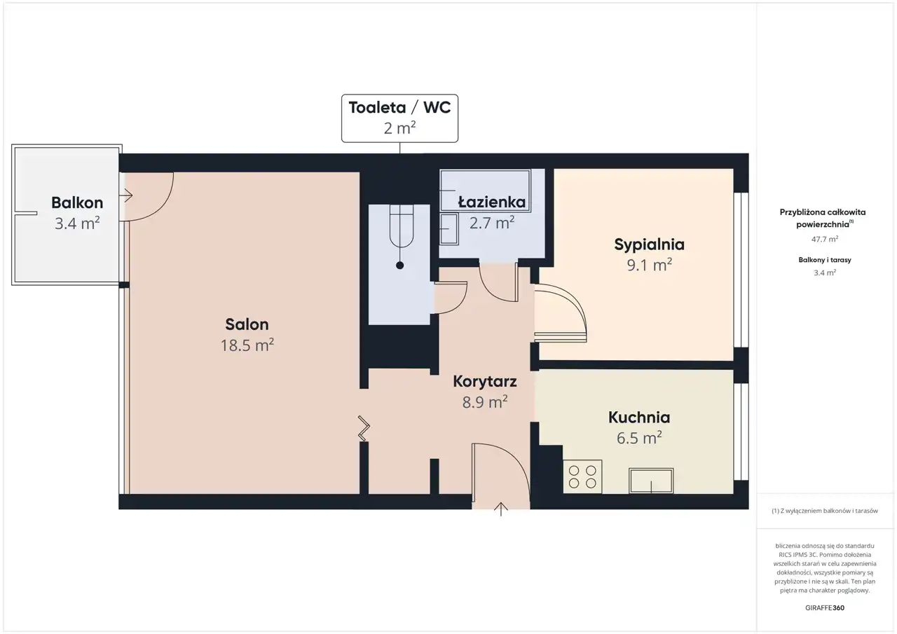 - Charakterystyka mieszkania 47.7 m2, 2 pokoje