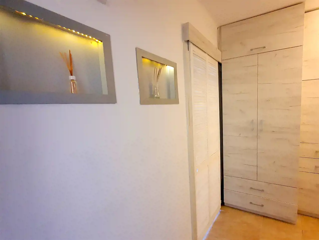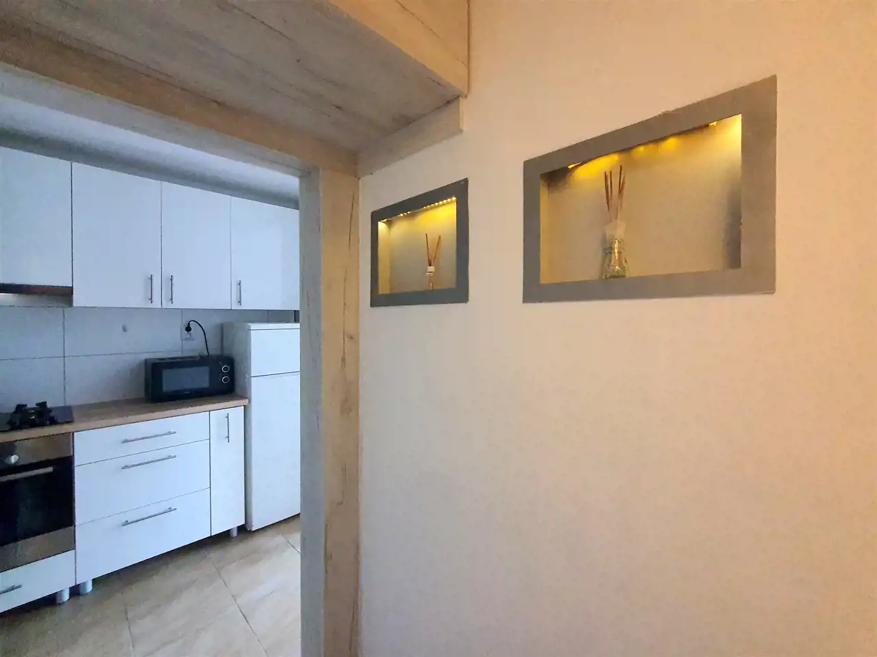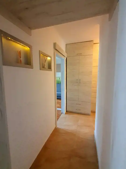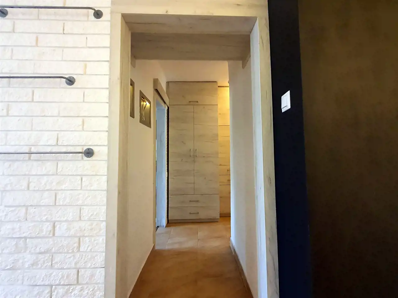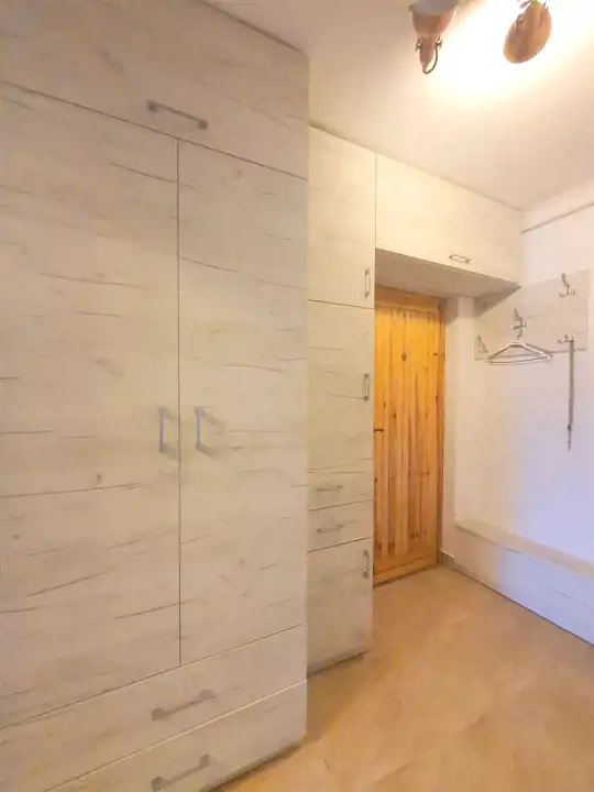 W przedpokoju i sypialni liczne szafy i szafki w stałej zabudowie.