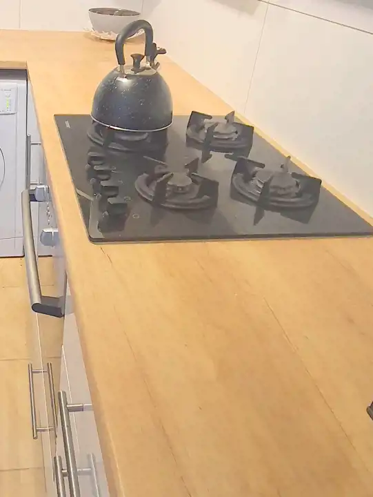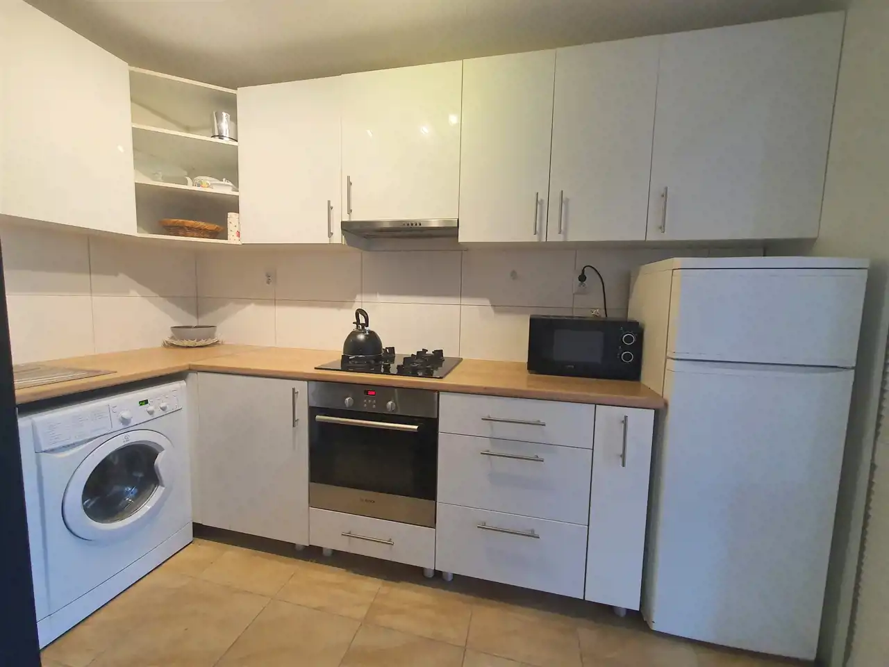 W pokojach na podłogach parkiet drewniany, w kuchni, łazience i przedpokoju terakota, ściany malowane, w kuchni glazura nowszego typu z dekoracyjnymi elementami (cegła, farba magnetyczna) oraz funkcjonalna zabudowa z lakierowanej płyty z nowoczesnym sprzętem AGD (płyta gazowa Zelmer, piekarnik Bosch, okap, lodówka, pralka).