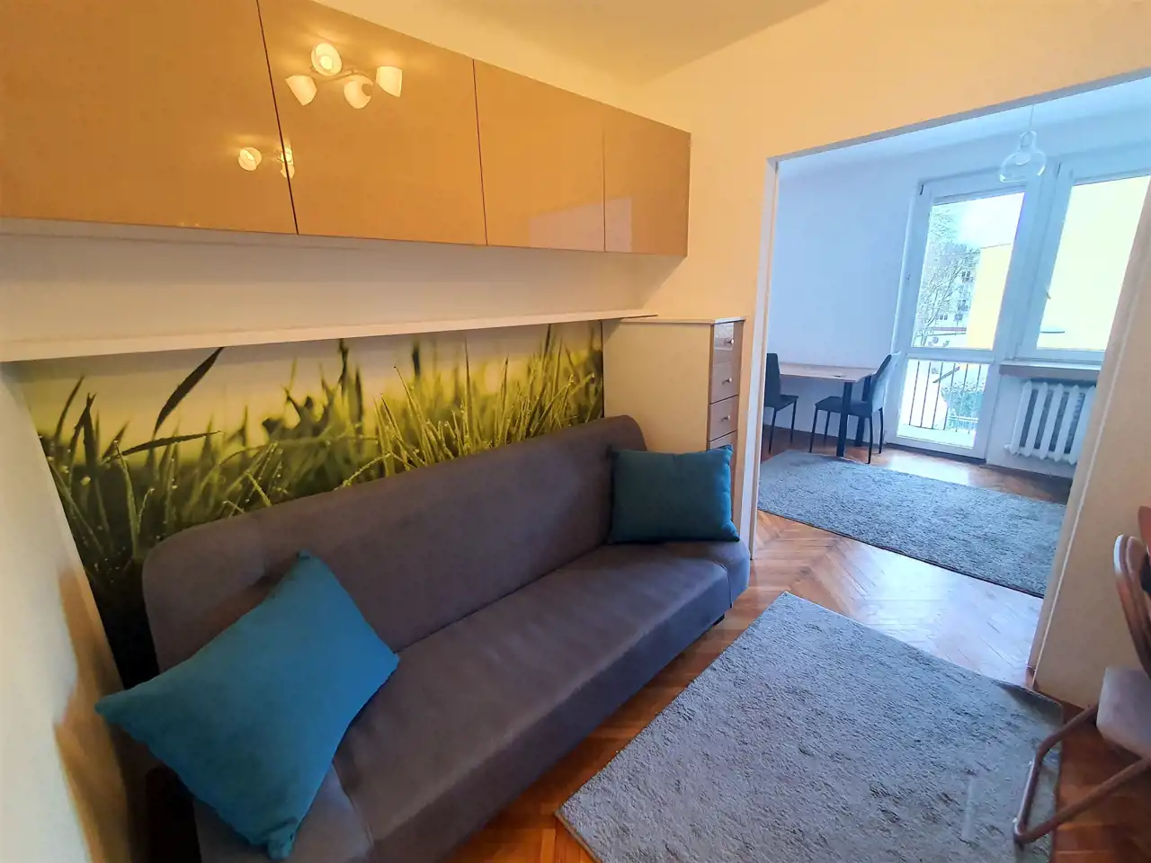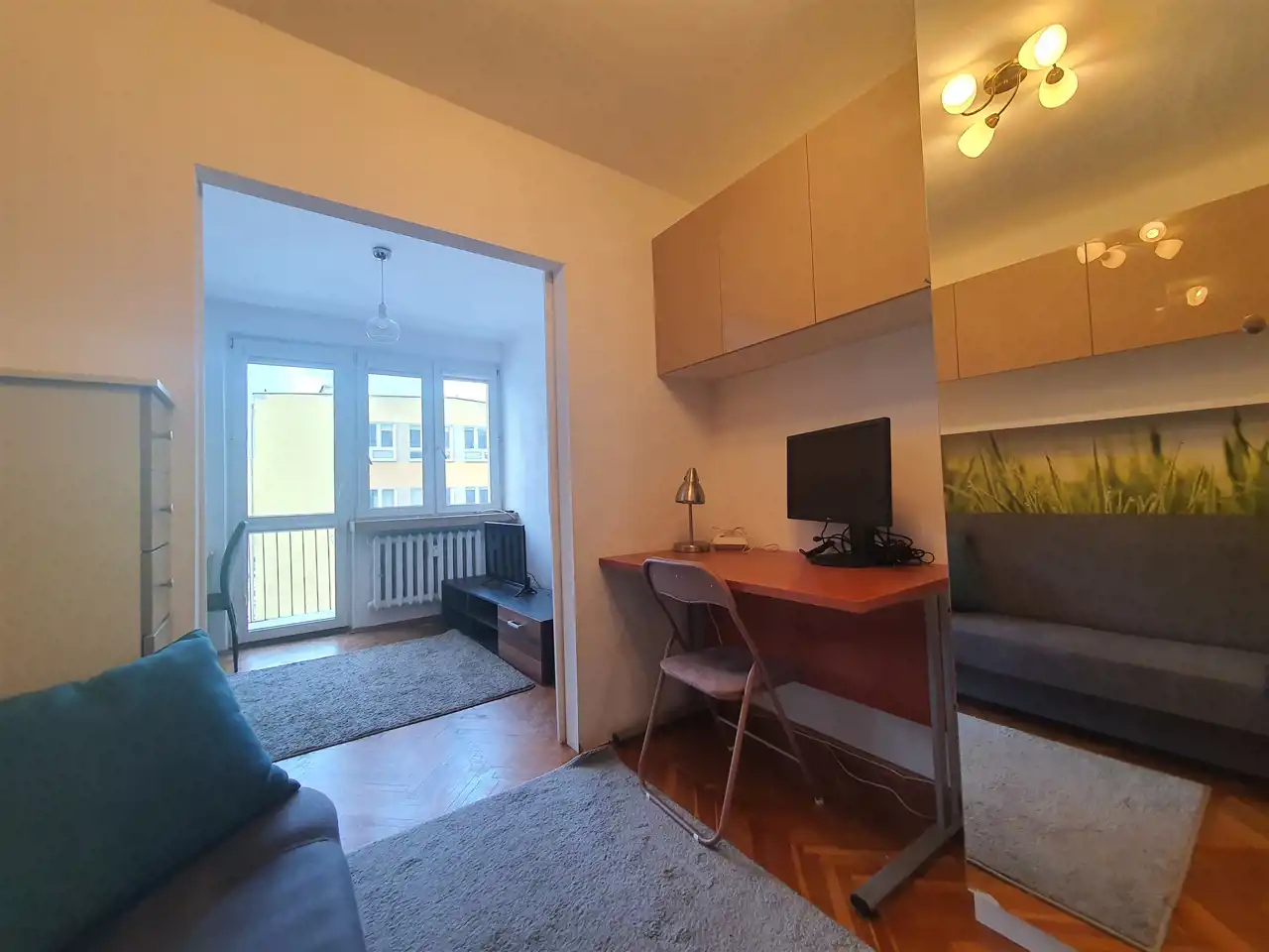Mieszkanie składa się z salonu z wyjściem na balkon, oddzielnie wydzielonej sypialni/gabinetu, kuchni, przedpokoju i łazienki. Do mieszkania przynależy piwnica.