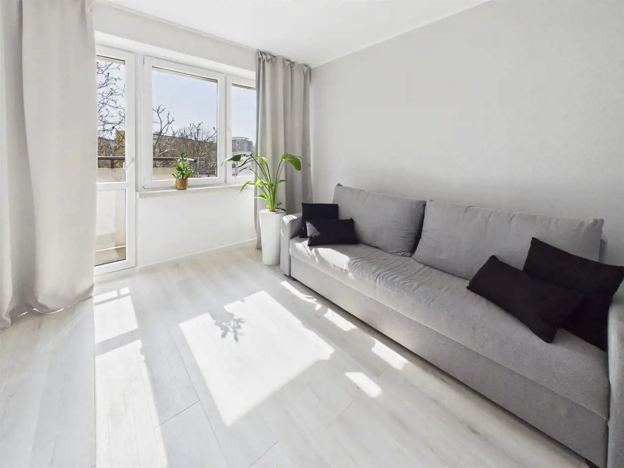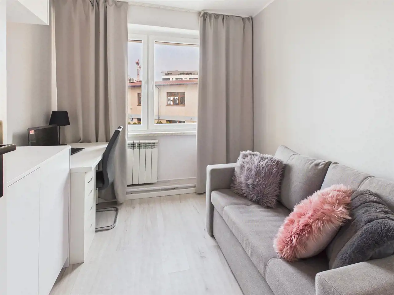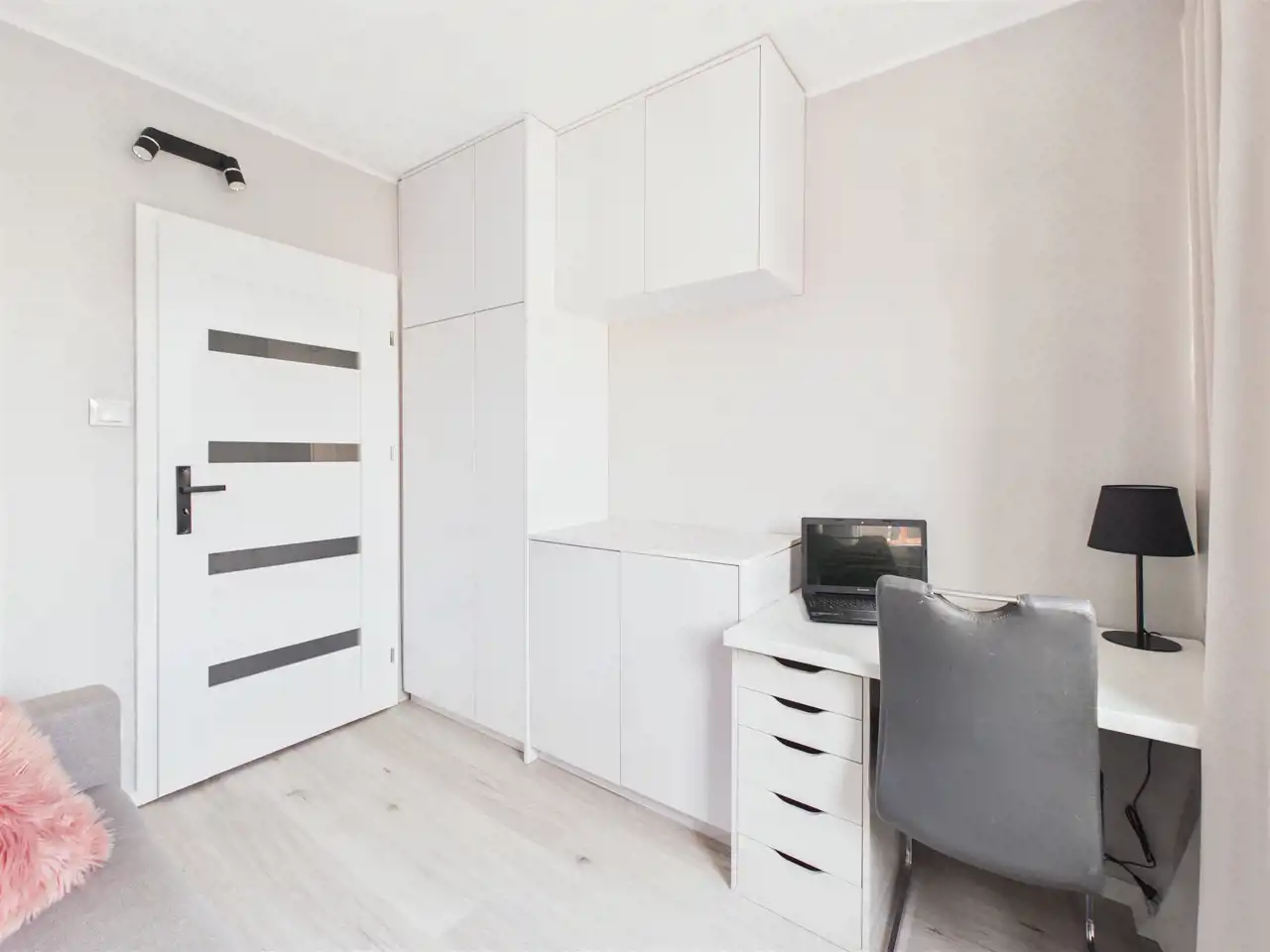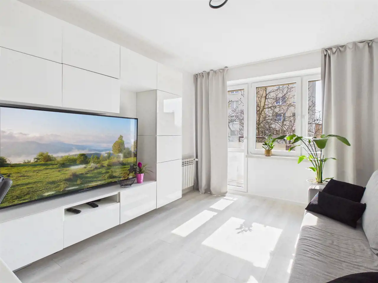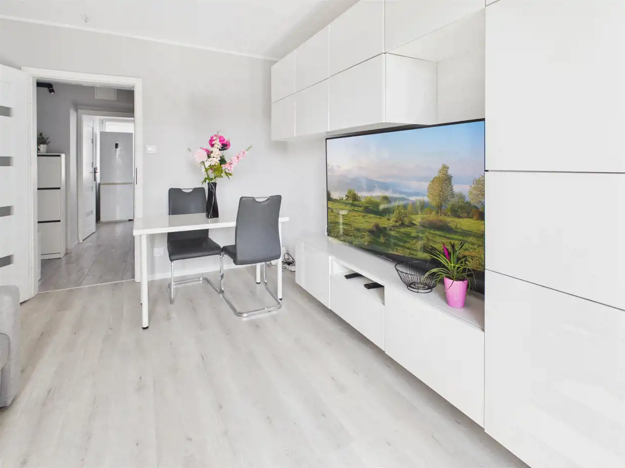Mieszkanie jest w pełni wykończone i urządzone w nowoczesnym, uniwersalnym stylu opartym na jasnych barwach i odcieniach szarości. Dzięki temu wnętrze jest spójne, estetyczne i gotowe do zamieszkania bez konieczności wprowadzania zmian.