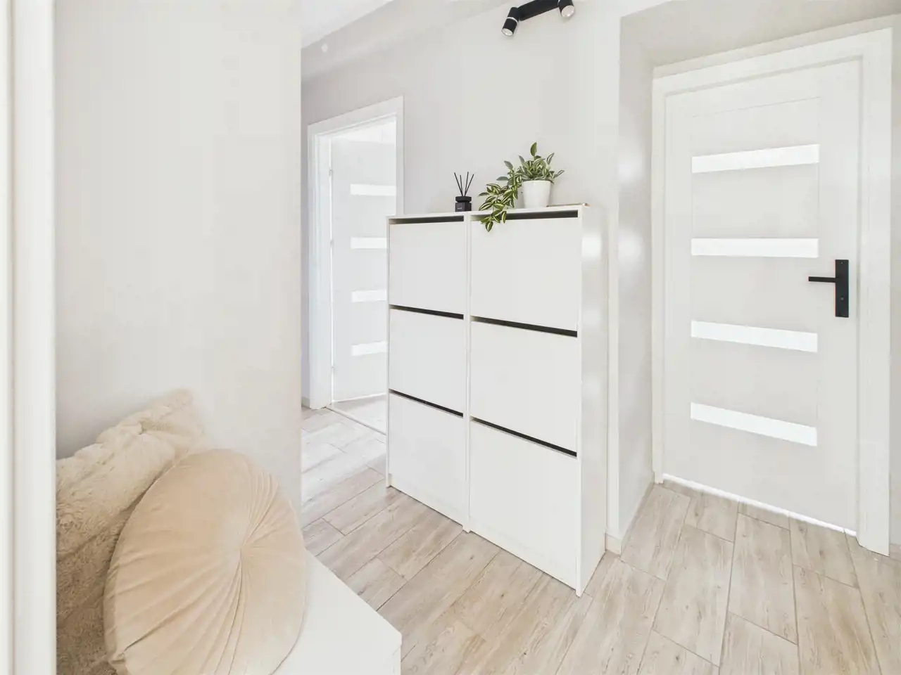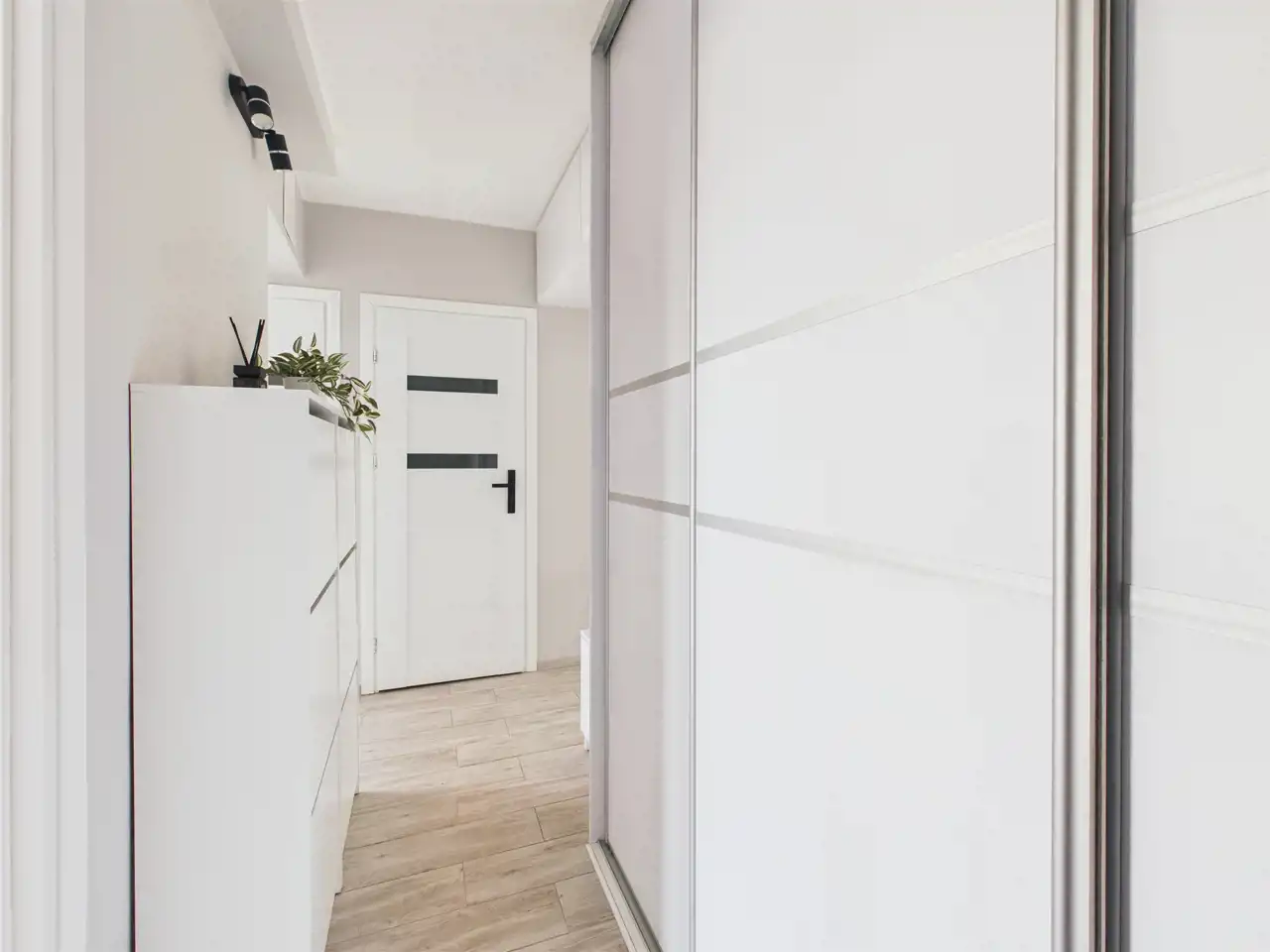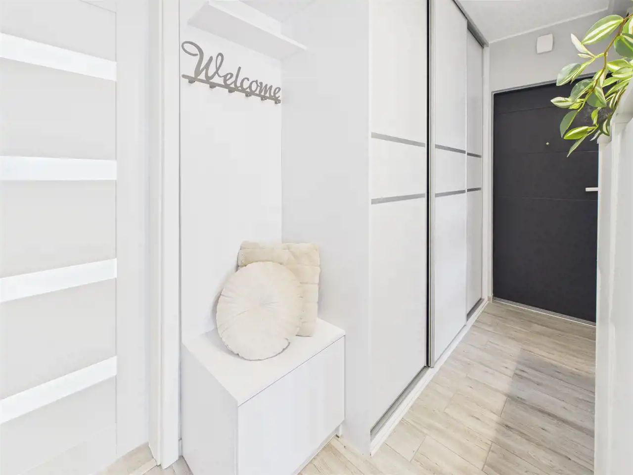 Dodatkowym udogodnieniem jest przestronny korytarz z pojemnymi szafami w zabudowie, który ułatwia utrzymanie porządku.