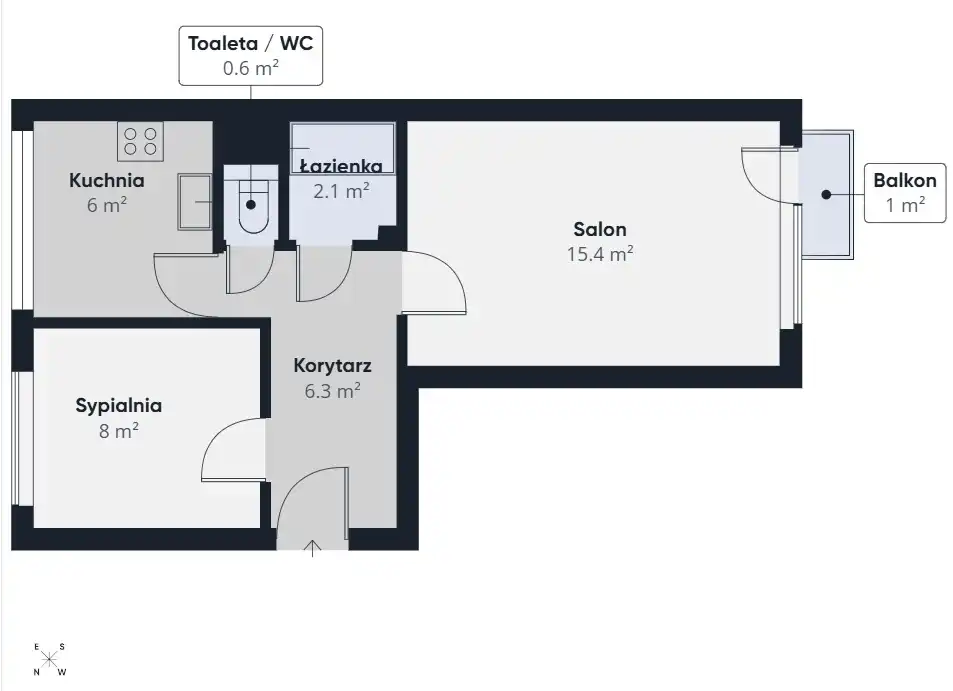 Przestronny, dobrze doświetlony salon z wyjściem na balkon stanowi komfortową strefę dzienną, idealną do odpoczynku i spotkań. Ekspozycja zapewnia dużą ilość naturalnego światła przez większą część dnia. Sypialnia została zaprojektowana w sposób praktyczny – oferuje miejsce zarówno do relaksu, jak i pracy, a zabudowy meblowe zapewniają dużo przestrzeni do przechowywania.