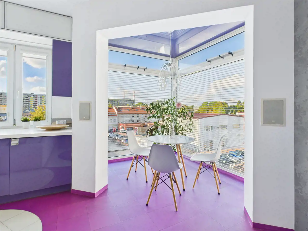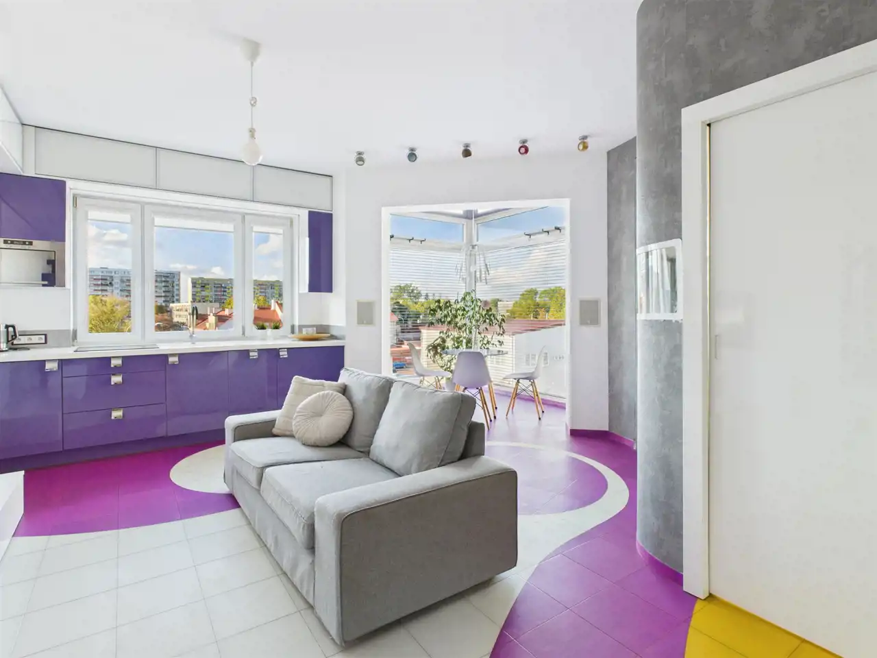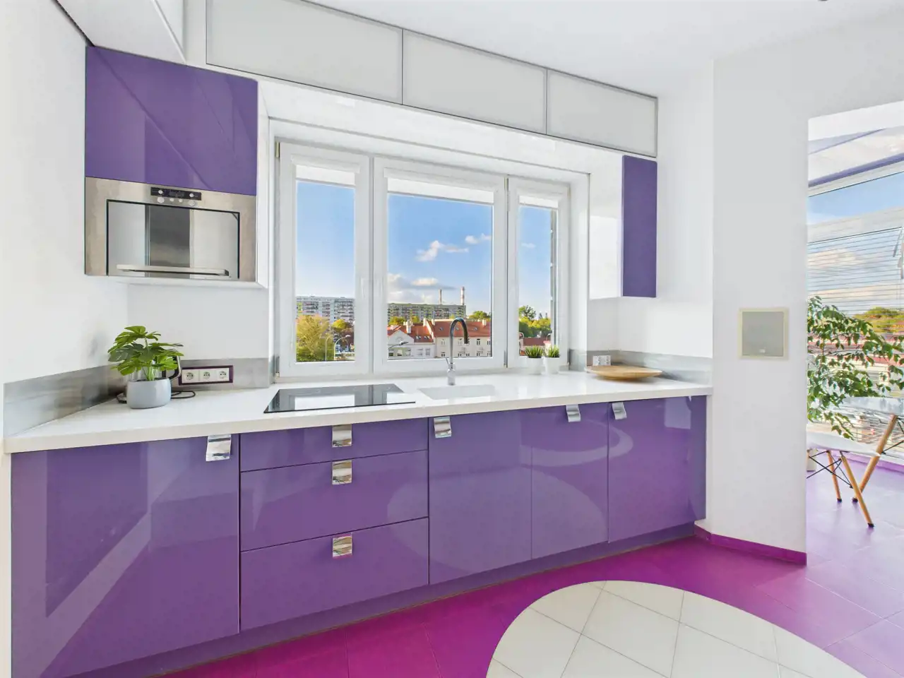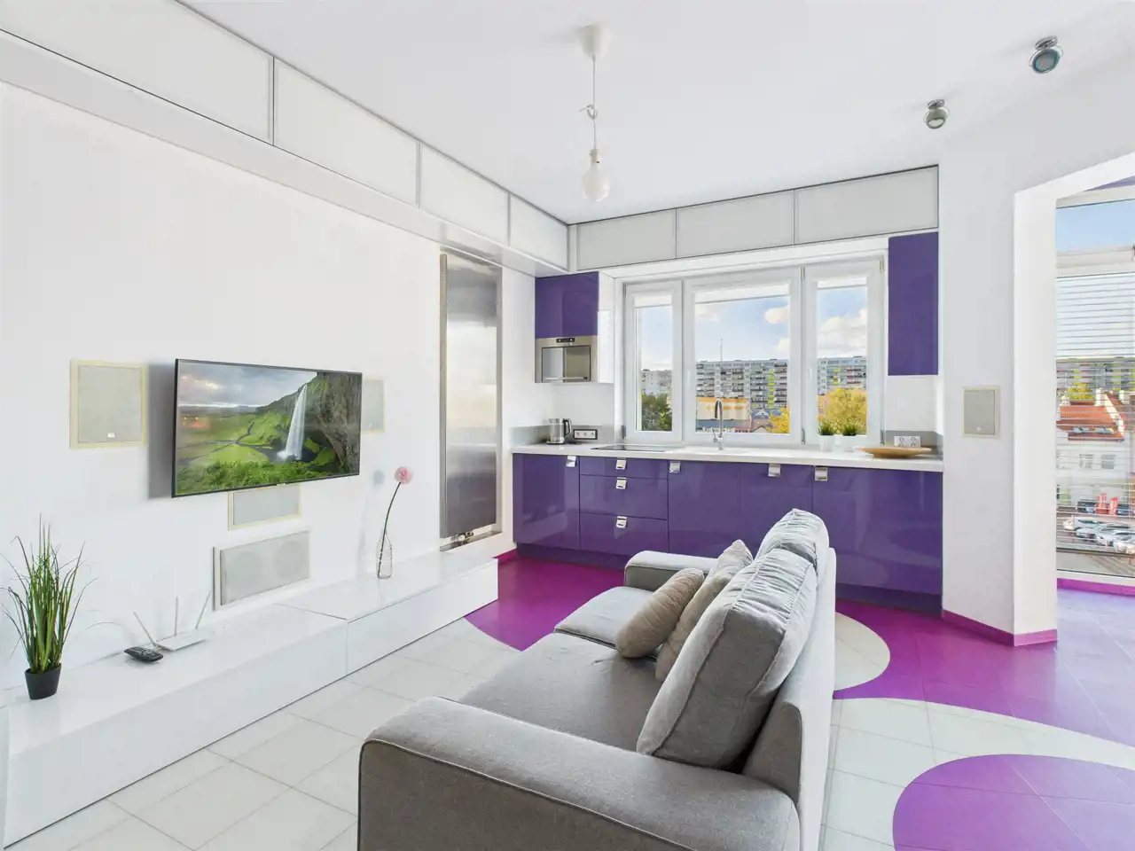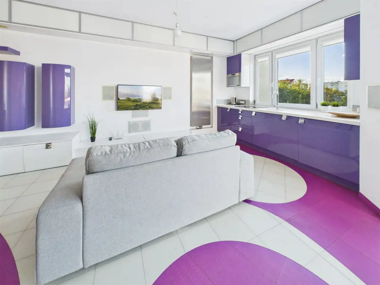 Salon z aneksem kuchennym – nowoczesna, otwarta przestrzeń, idealna do życia i relaksu. Kuchnia w zabudowie, wyposażona w sprzęt AGD. Wnętrze spójne kolorystycznie – dominują odważne fiolety, biel i akcenty żółci, co nadaje całości artystycznego i energetycznego charakteru.