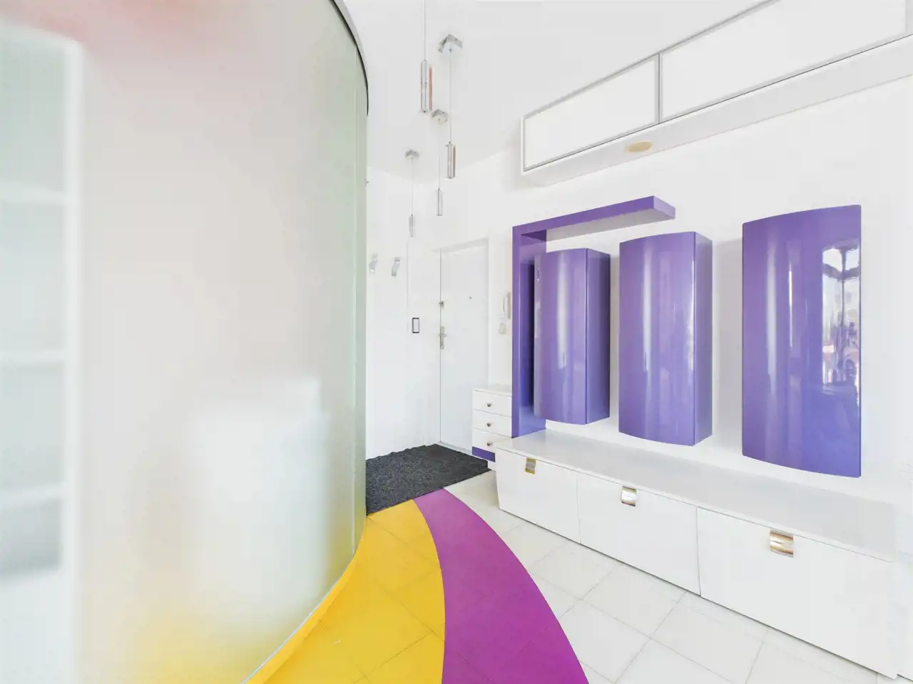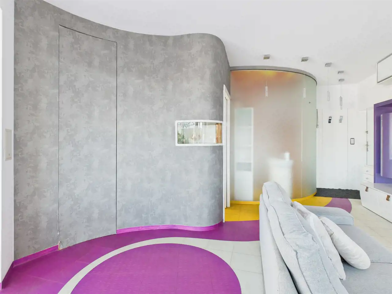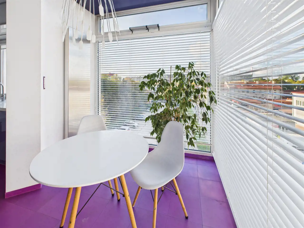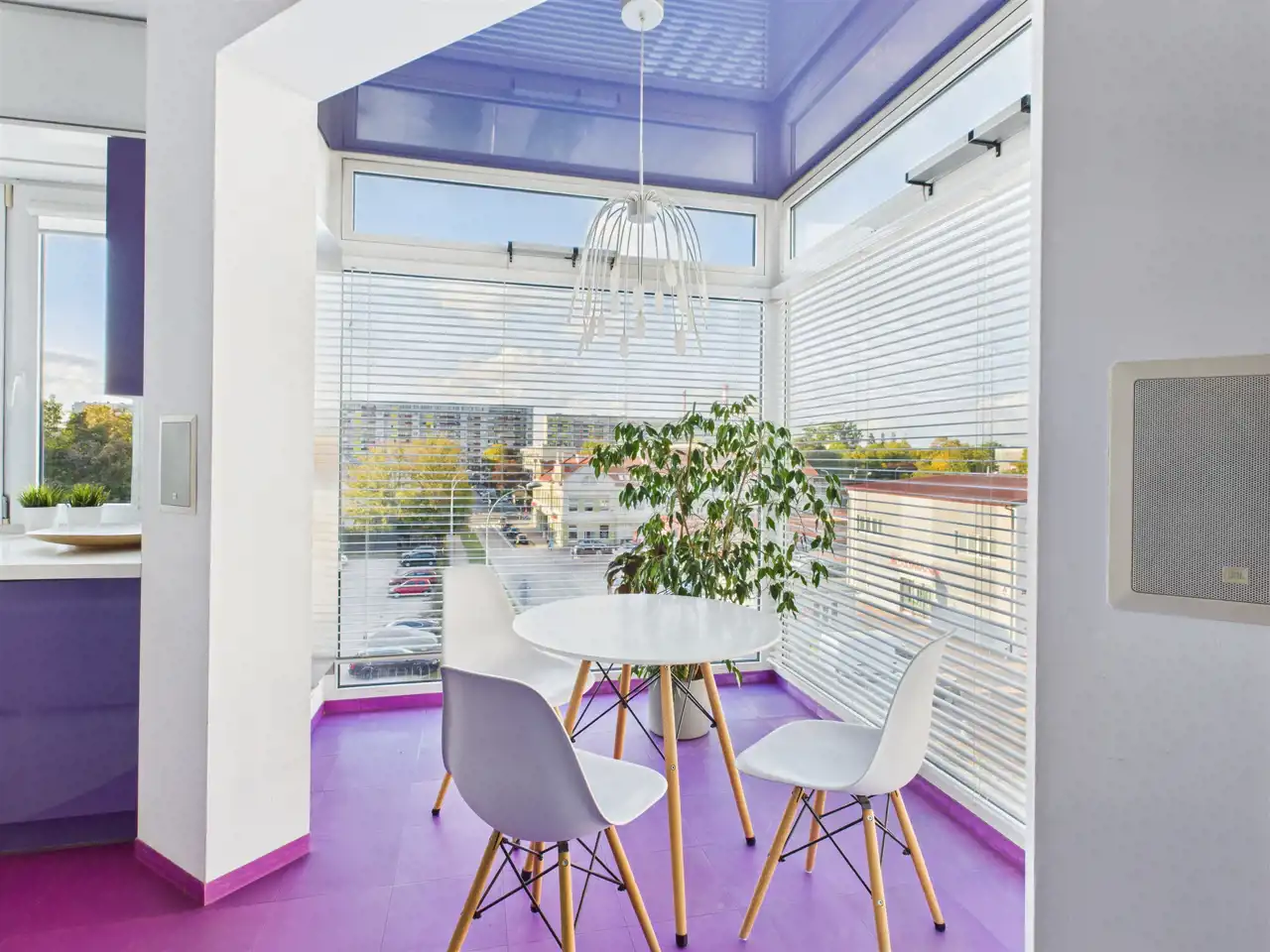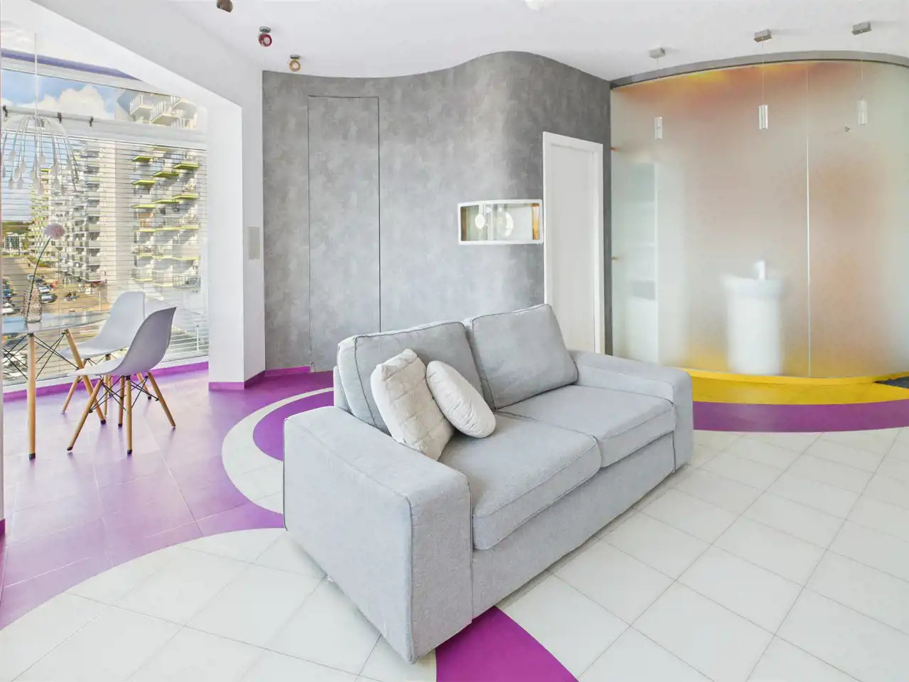 Salon z aneksem kuchennym – nowoczesna, otwarta przestrzeń, idealna do życia i relaksu. Kuchnia w zabudowie, wyposażona w sprzęt AGD. Wnętrze spójne kolorystycznie – dominują odważne fiolety, biel i akcenty żółci, co nadaje całości artystycznego i energetycznego charakteru.