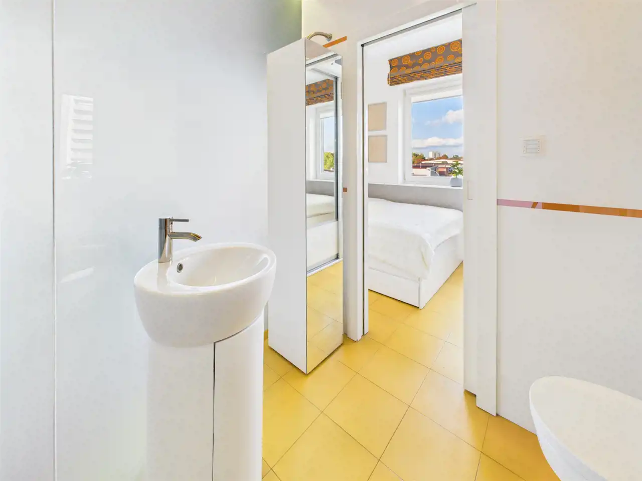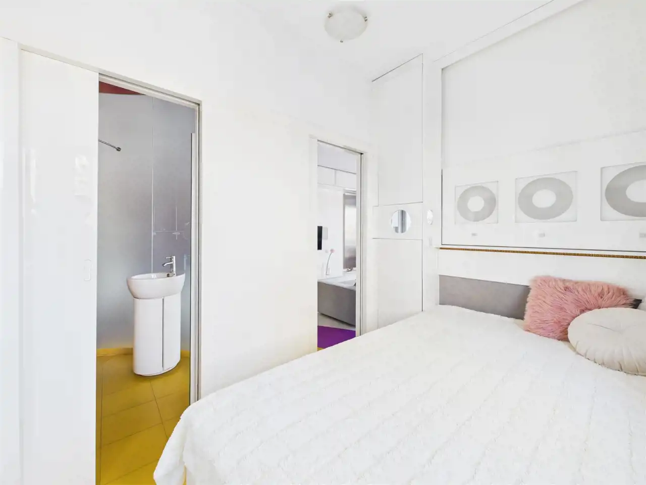 Sypialnia – przytulna i funkcjonalna, z dużym łóżkiem i zabudowaną szafą. Bezpośrednie przejście do prywatnej łazienki, w której znajduje się nowoczesny prysznic, designerskie oświetlenie i oryginalne detale wykończeniowe.