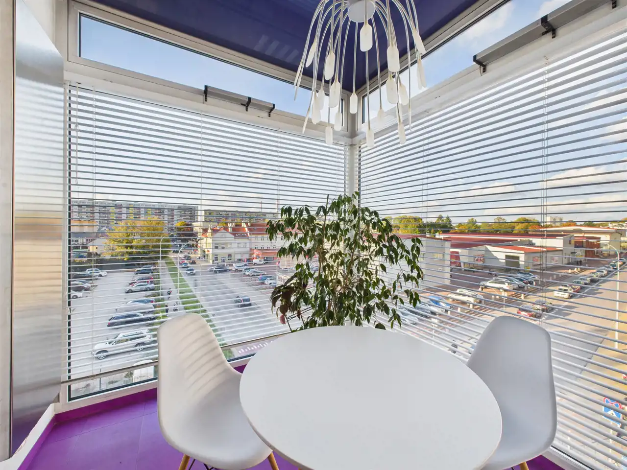 Przeszklone patio zamiast balkonu – niecodzienne rozwiązanie z dużymi panoramicznymi oknami, które oferują widok na zadbane osiedle i wpuszczają mnóstwo naturalnego światła.