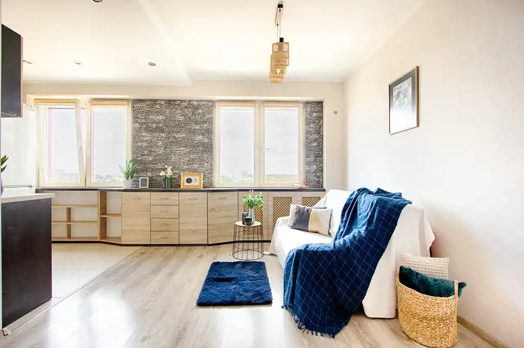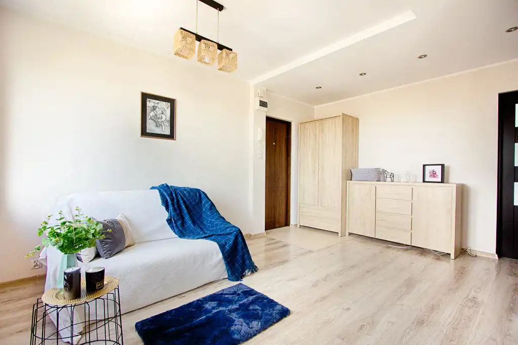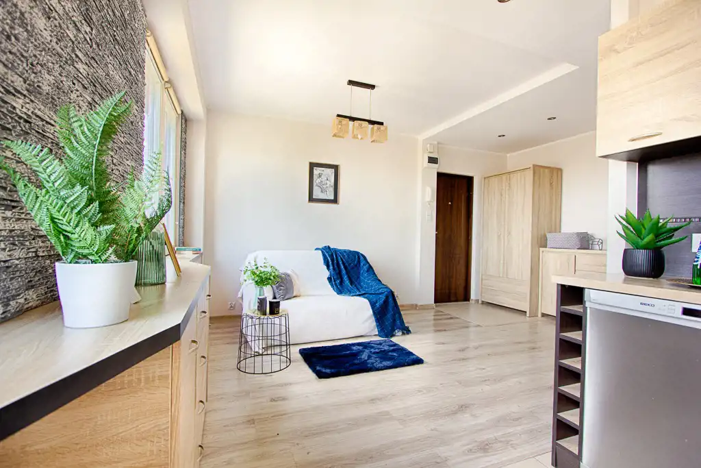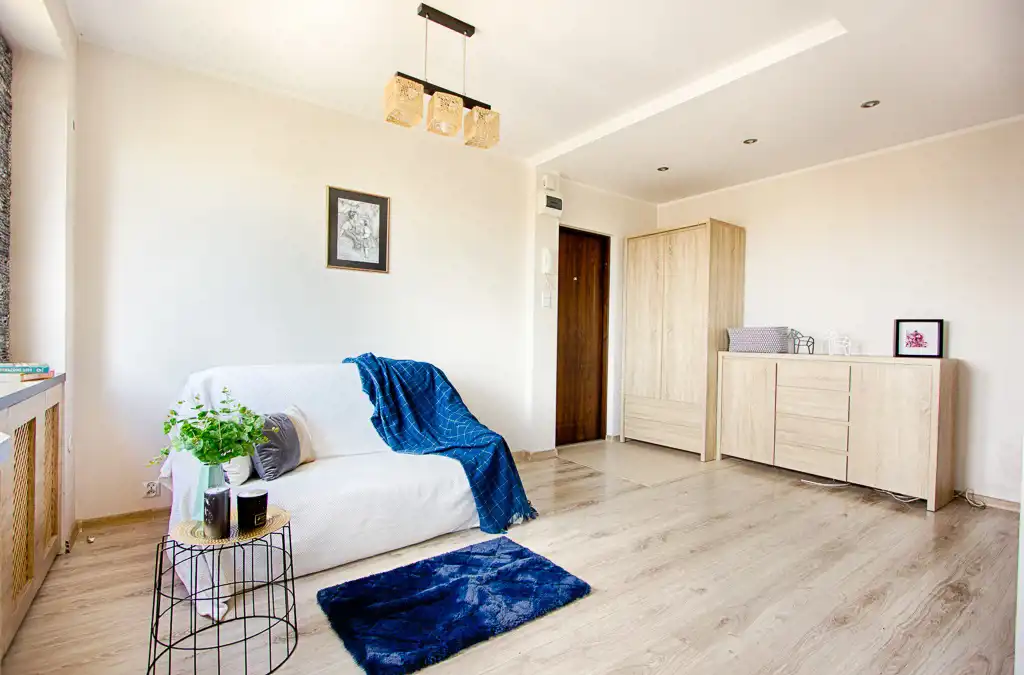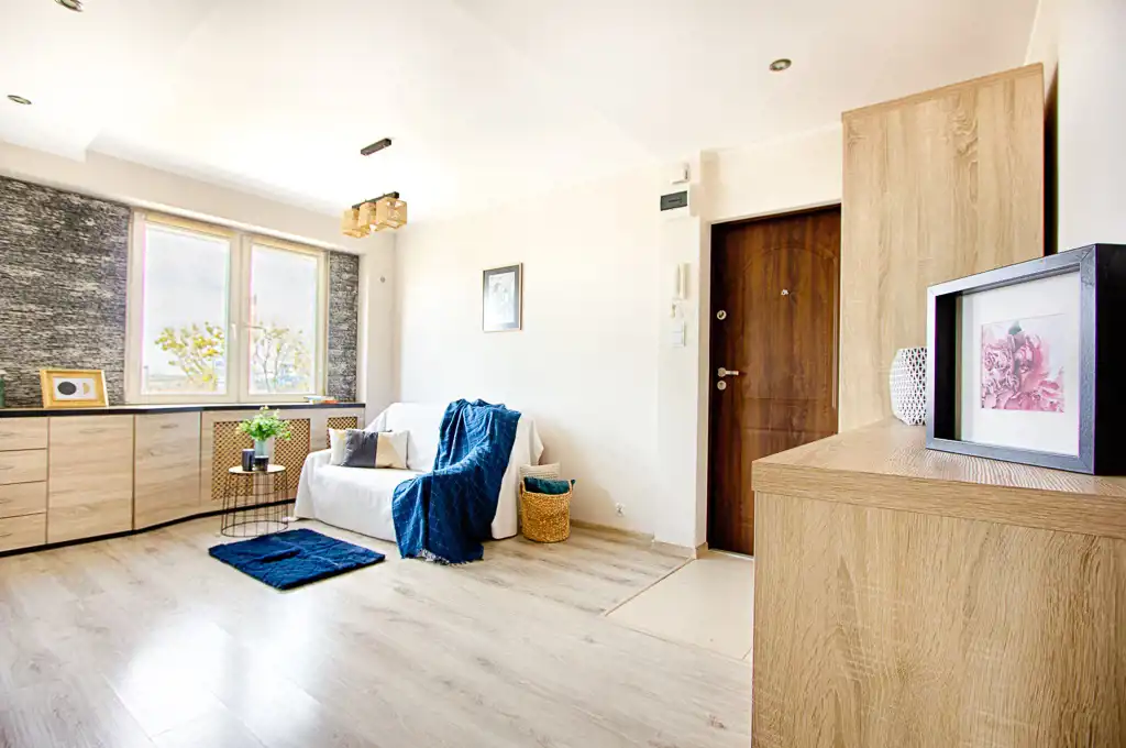 Lokal posiada bardzo funkcjonalny dwustronny rozkład pomieszczeń. Na powierzchnię 48,60 m2 składa się salon połączony z kuchnią, przestronna sypialnia w wyjściem na balkon, korytarz oraz łazienka. Możliwy jest powrót do oryginalnego układu: z oddzielną kuchnią i dodatkowym pokojem. Mieszkanie gotowe do zamieszkania, wyposażone w meble oraz sprzęty AGD.