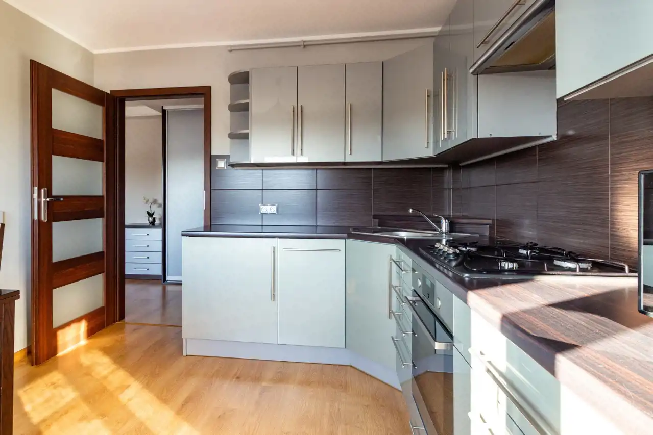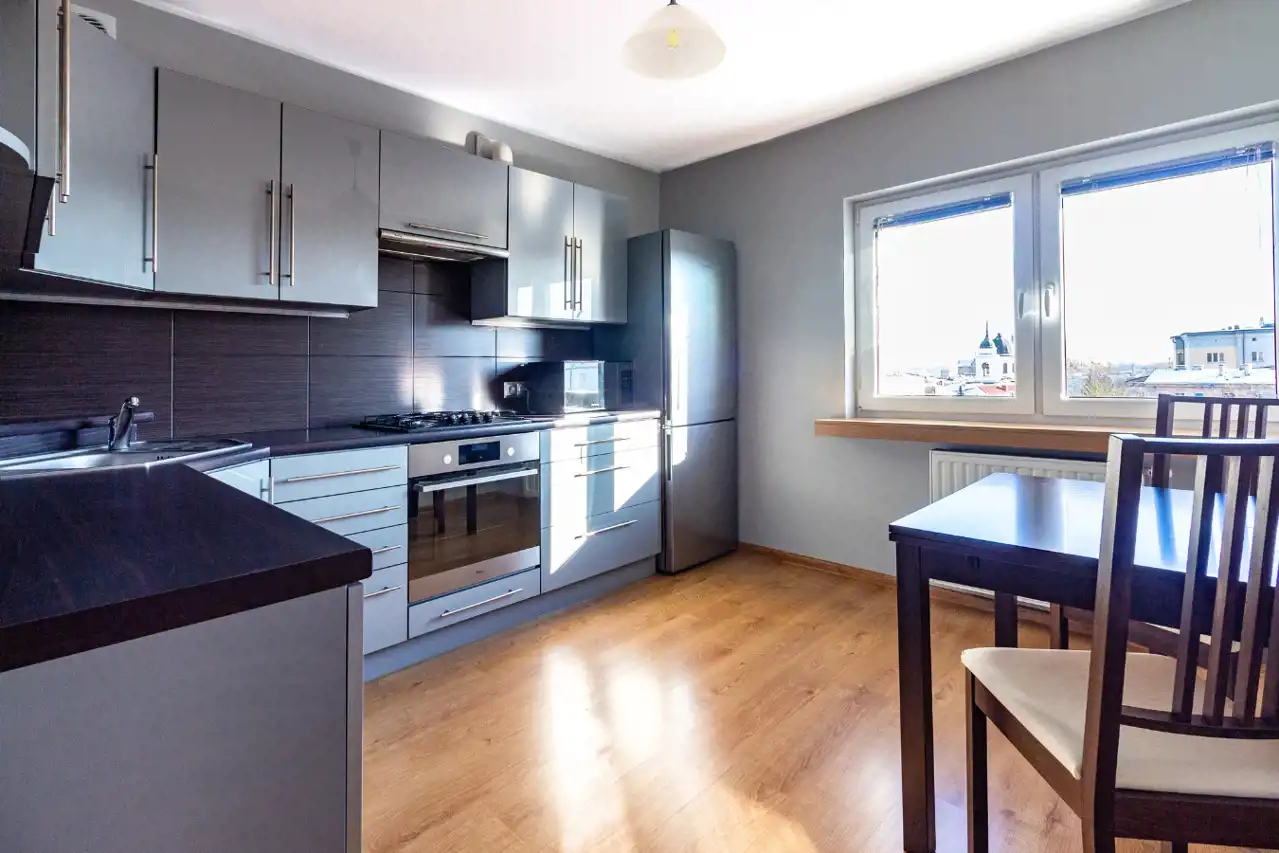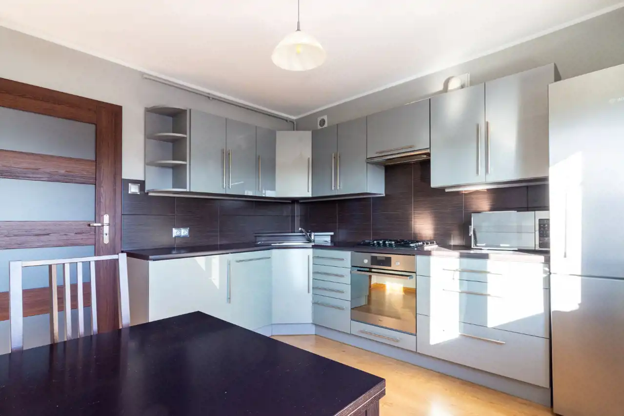 Cena obejmuje pełne wyposażenie widoczne na zdjęciach. Kuchnia została zaprojektowana bardzo funkcjonalnie – zabudowa mieści pralkę, zmywarkę, piekarnik, płytę gazową oraz dużą lodówkę. Dzięki powierzchni ponad 10m² bez problemu znalazło się tu miejsce na duży stół.