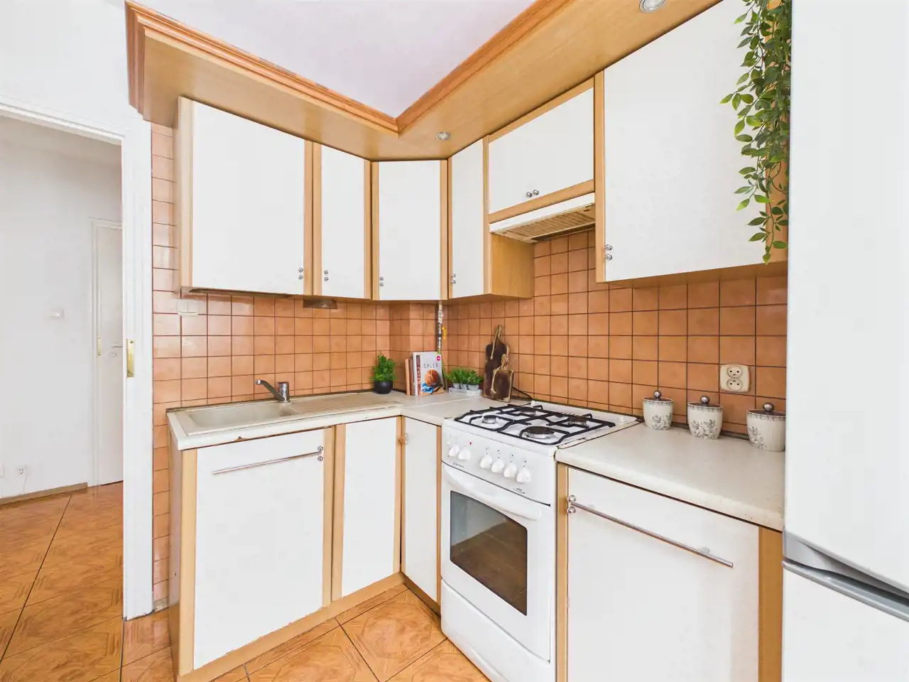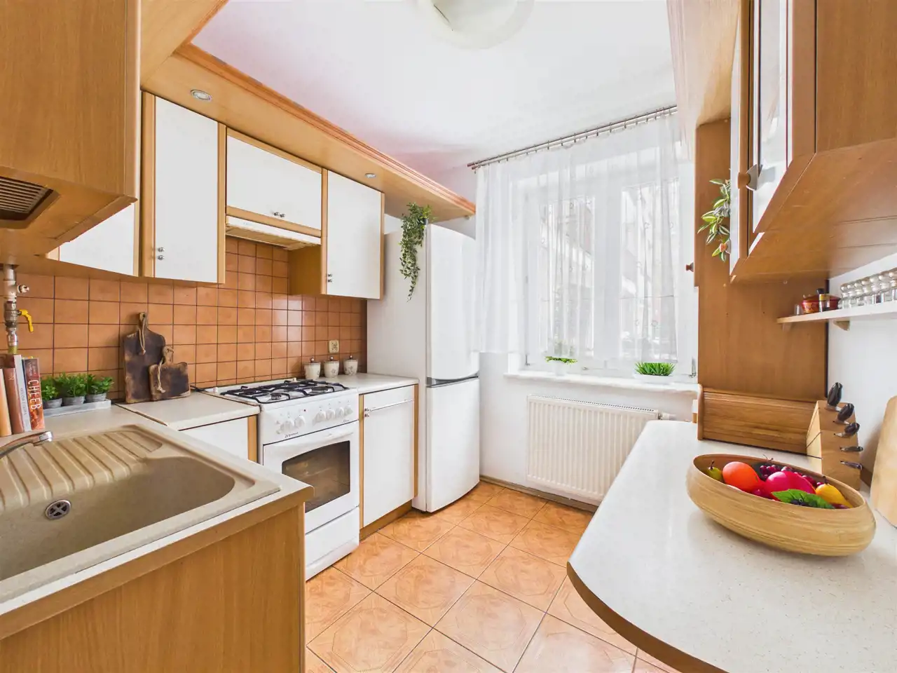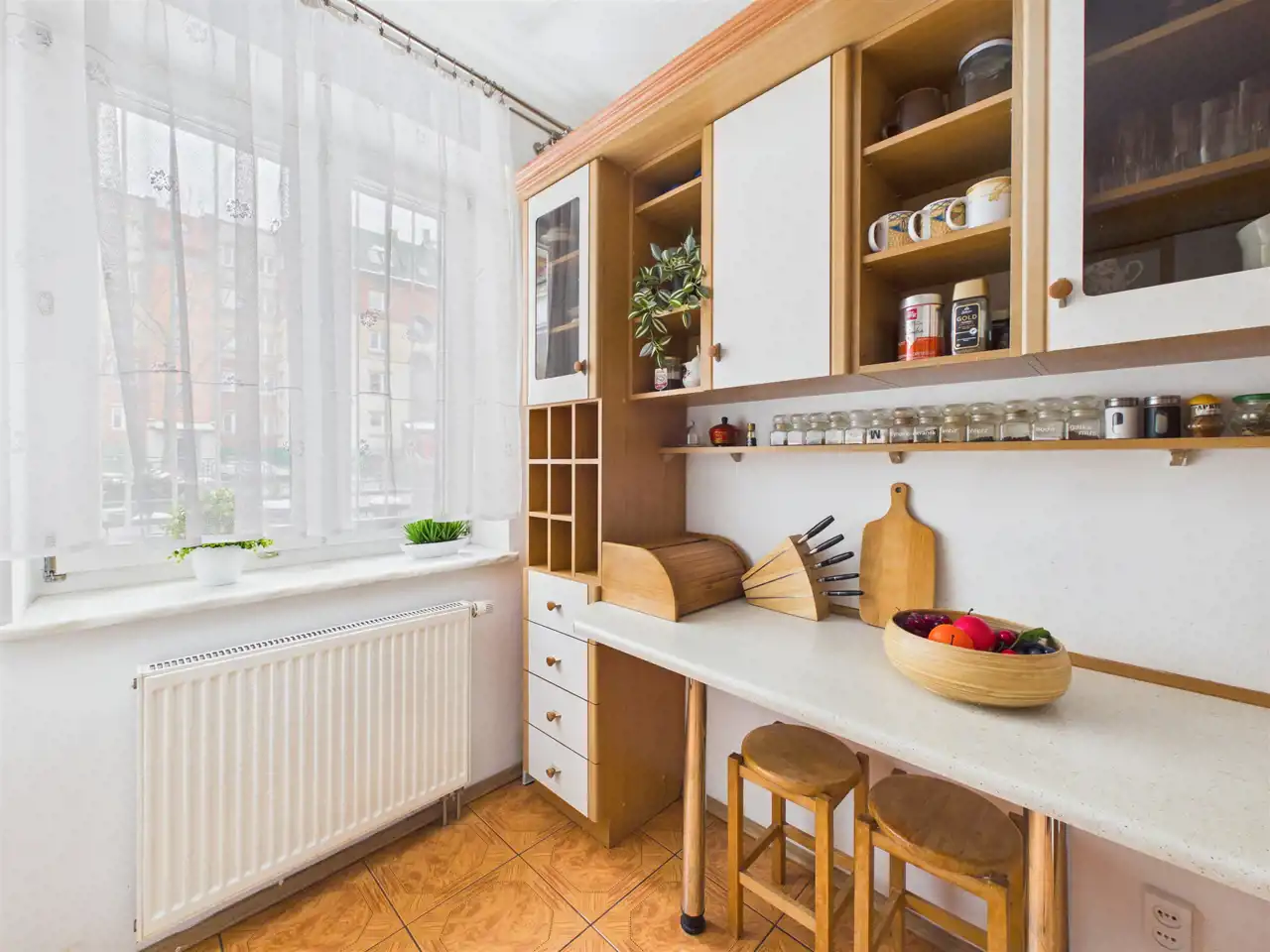 Kuchnia: Oddzielna, widna i bardzo ustawna. Duża ilość blatu roboczego i szafek sprawia, że gotowanie jest tu czystą przyjemnością.