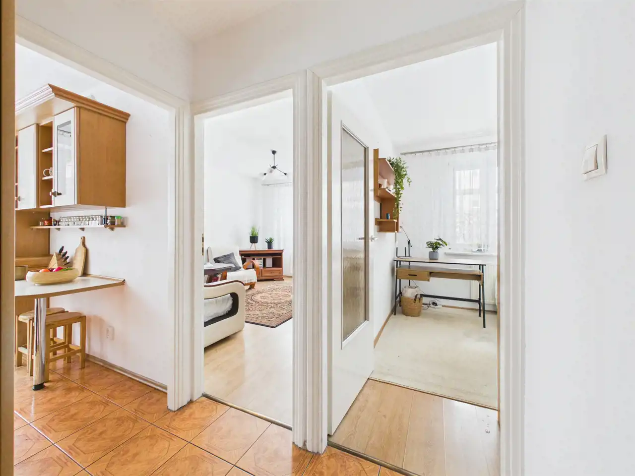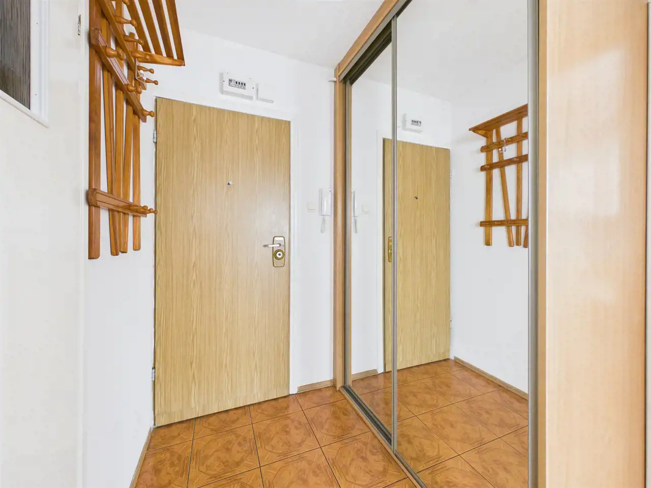 Przedpokój: Z pojemną szafą w zabudowie, która ułatwia utrzymanie porządku. Stąd wejdziesz do każdego z pomieszczeń.
