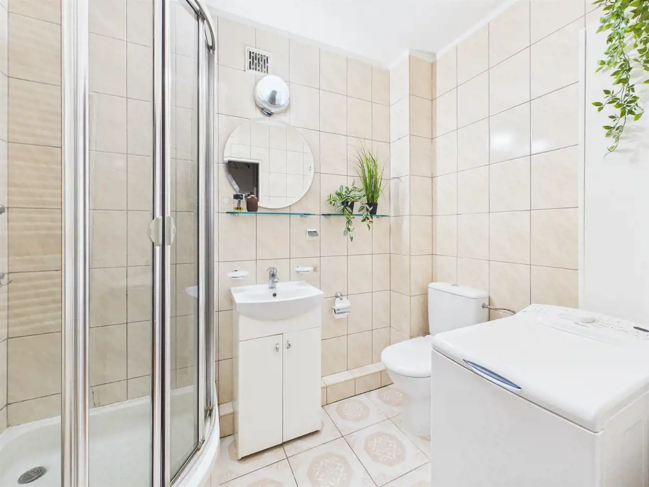 Łazienka: Kompaktowa i przemyślana – z prysznicem, WC oraz wygospodarowanym miejscem na pralkę i szafkę.