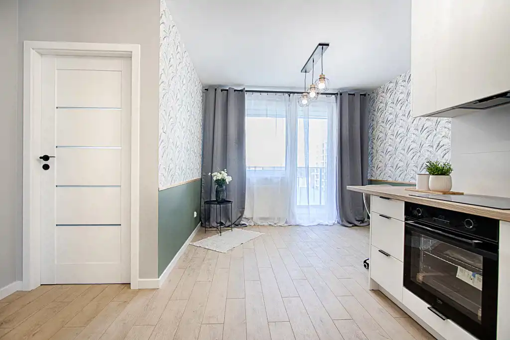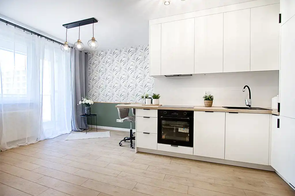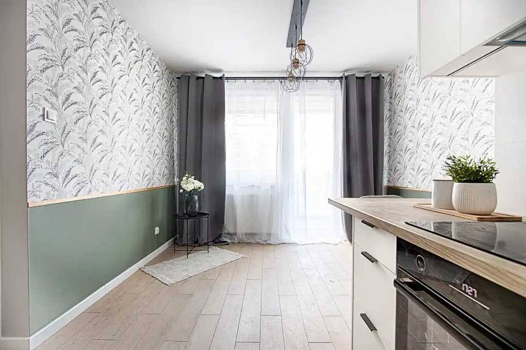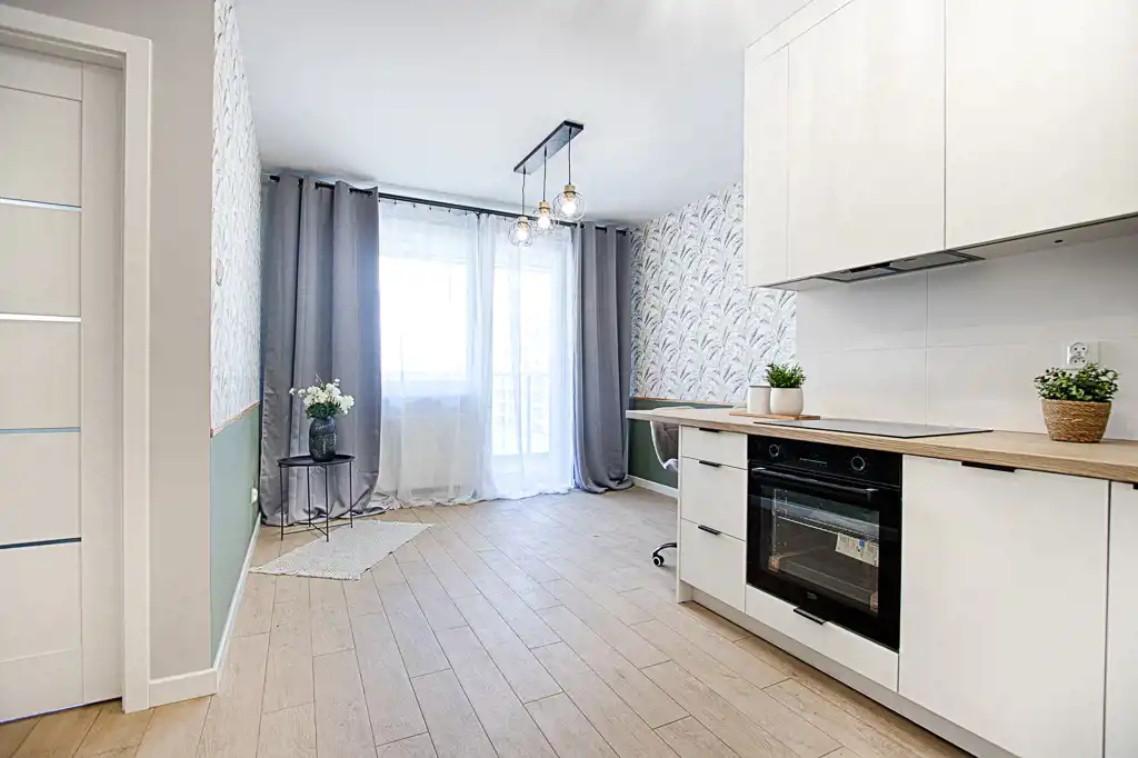 Kuchnia została wykonana w zabudowie na wymiar i wyposażona w nowoczesny sprzęt AGD (lodówka, zmywarka, piekarnik, płyta indukcyjna, okap) – wszystkie urządzenia objęte są gwarancją. Wnętrze zostało gustownie wykończone, z dbałością o detale.