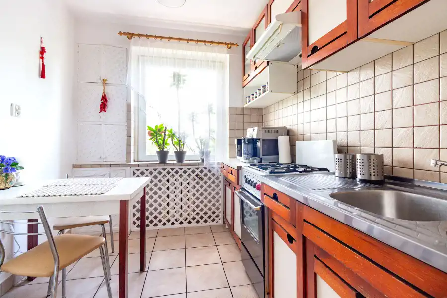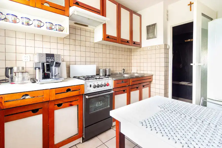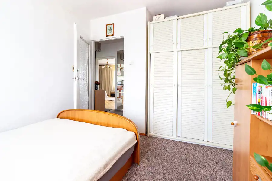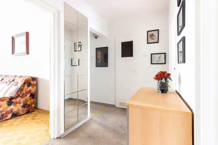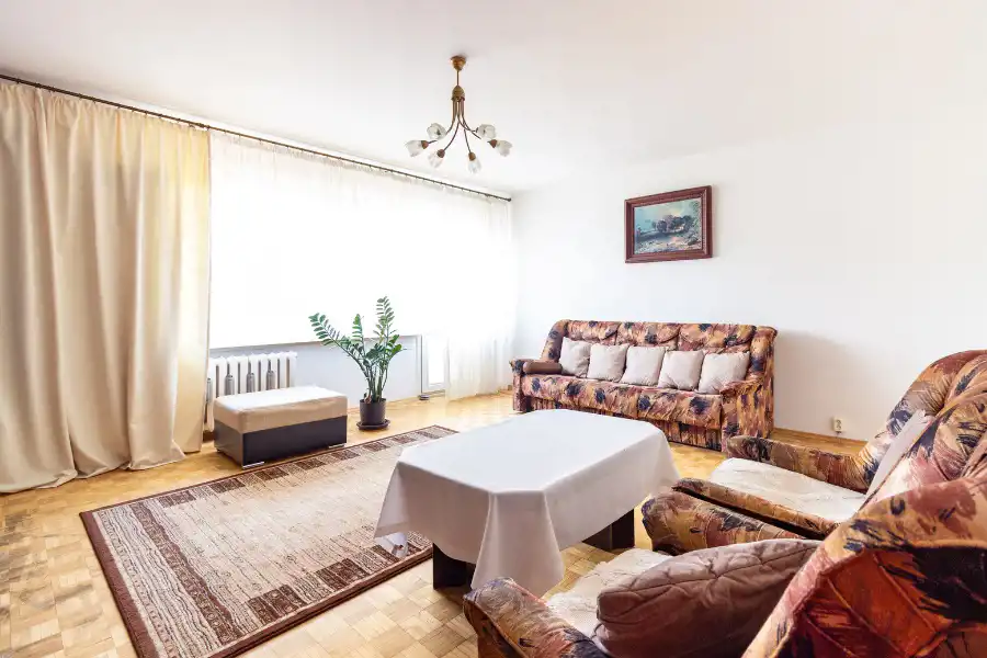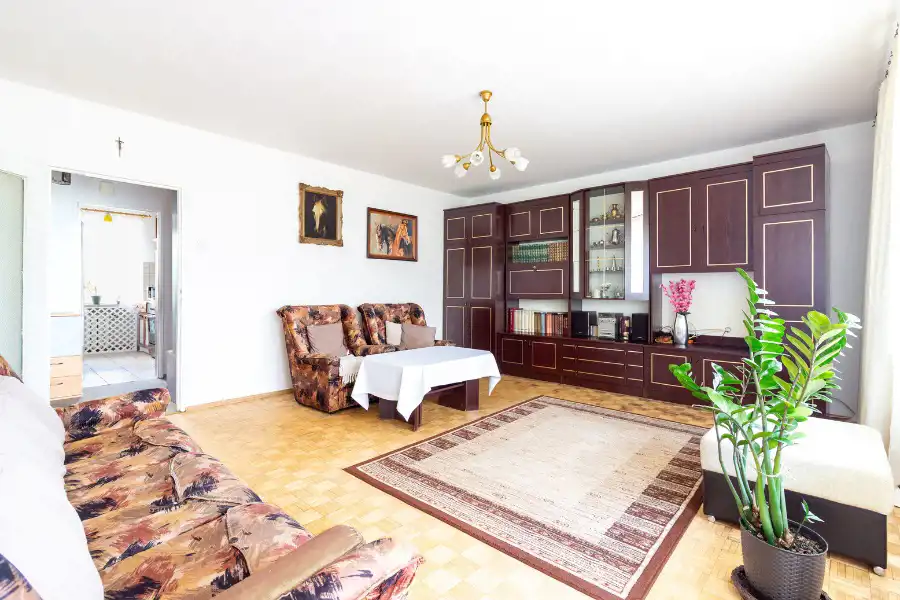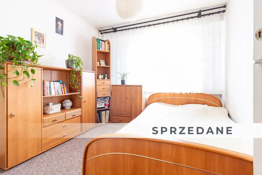 Mieszkanie jest bardzo jasne i słoneczne z ekspozycją okien na północny wschód i południowy zachód. Położonej na 3 piętrze w 4-piętrowym bloku. Składa się z przedpokoju, pokoju dziennego z balkonem, 2 sypialni, kuchni, łazienki i osobnego wc. Podłogi wyłożone drewnianą mozaiką, w przedpokoju i sypialniach przykrytą wykładziną. Stan pomieszczeń jest dobry. Mieszkanie jest zadbane, choć docelowo wymaga remontu.