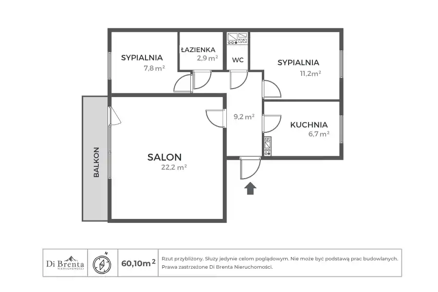 Powierzchnia nieruchomości wynosi 61m2 i składa się na nią: