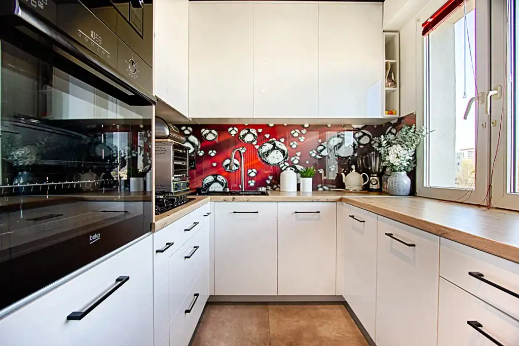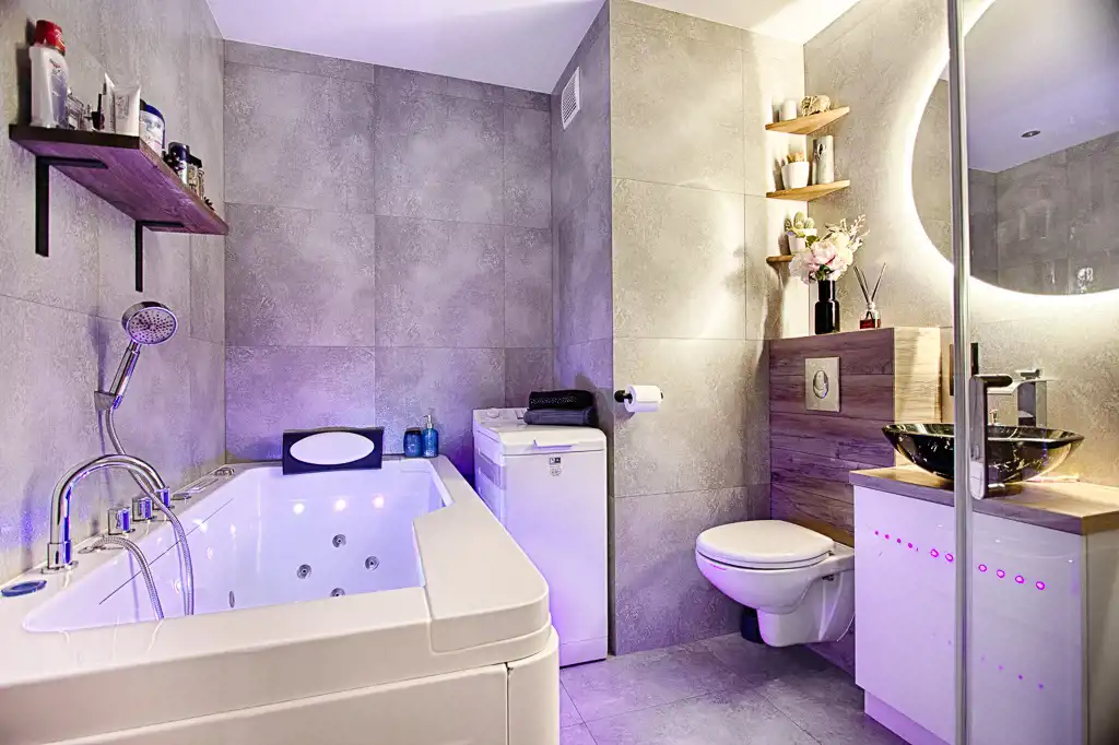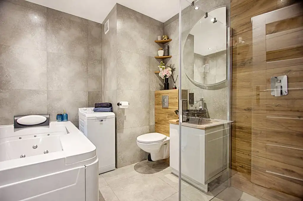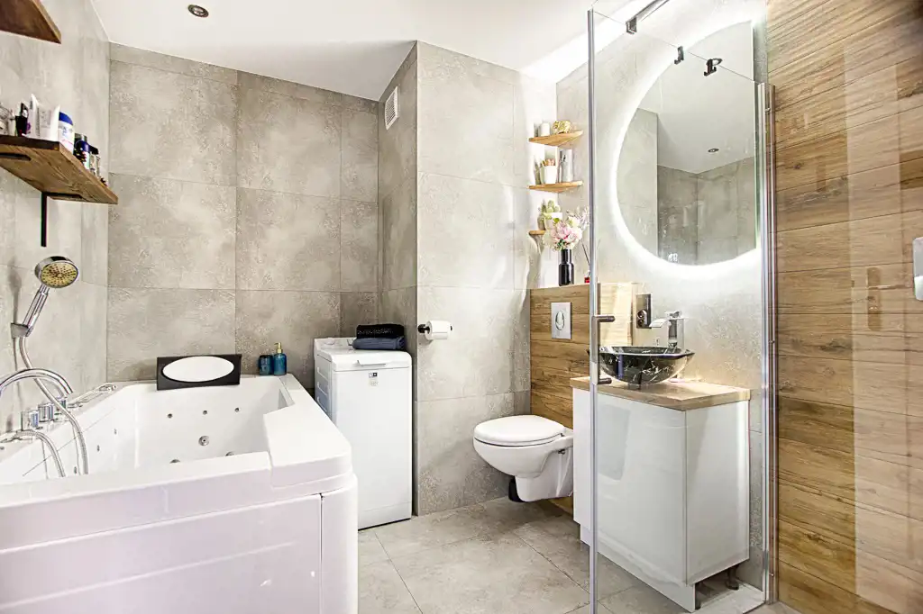 Wnętrza zostały urządzone w nowoczesnym stylu oraz spójnej kolorystyce. Charakteru nadają całości nowoczesne materiały wykończeniowe. Zabudowa kuchenna wyposażona w niezbędne sprzęty AGD. Łazienka wyposażona w wannę z hydromasażem oraz prysznic.