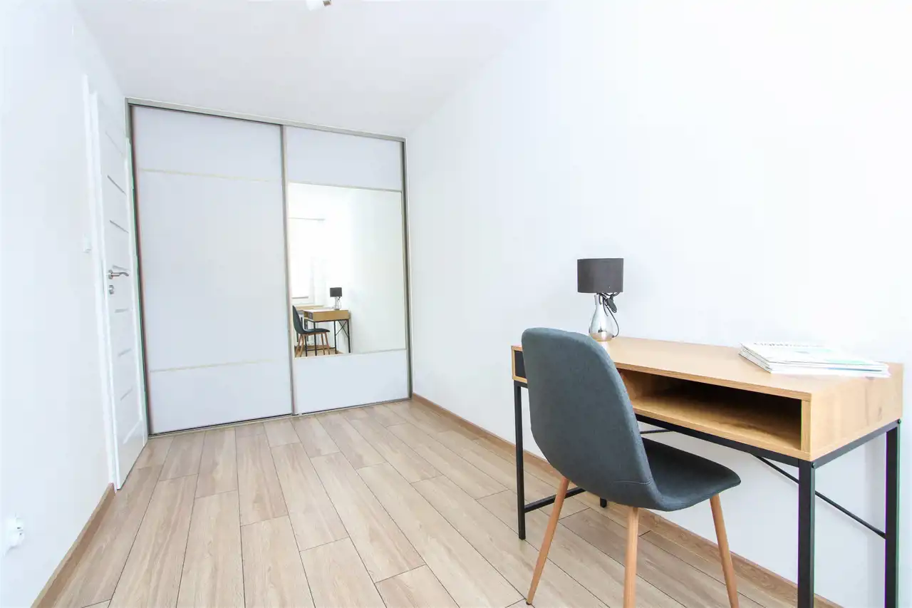 Standard mieszkania bardzo dobry - nadaje się do wprowadzenia. Wymieniono instalację elektryczną oraz hydrauliczną. Lokal wykończony jest w neutralnych i przyjemnych kolorach: nowe panele podłogowe, nowoczesna łazienka ze sporą ilością szafek do przechowywania oraz kuchnia ze stałą zabudową i sprzętami w zabudowie - piekarnikiem umieszczonym wyżej ze względu na komfort użytkowania, dużą zmywarką w zabudowie, płytą, okapem i wolnostojącą lodówką Samsung. W jednej z sypialni znajduje się duża szafa w zabudowie stałej, biurko, a w drugiej szafa wolnostojąca, szafka RTV, rozkładana kanapa. W salonie znajduje się wygodny stół z krzesłami, narożna rozkładana kanapa, stolik kawowy, szafka pod telewizor.