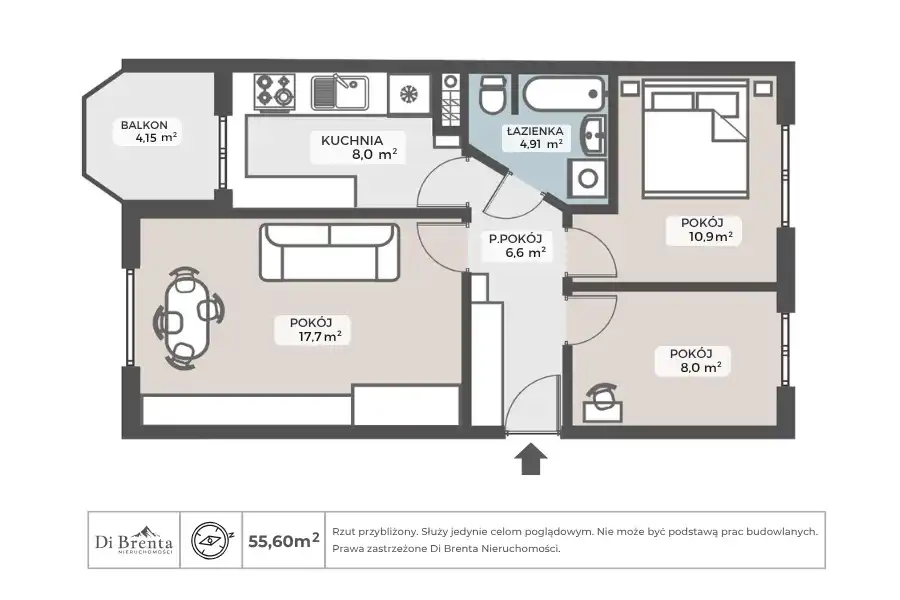 - Charakterystyka mieszkania 55.6 m2, 3 pokoje