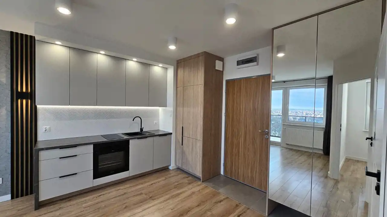 Mieszkanie wykończone gotowe do odbioru koniec lutego 2026r przy wykorzystaniu materiałów wysokiej jakości z nowym sprzętem AGD w kuchni(sprzęt - piekarnik, lodówka, płyta indukcyjna, okap, zmywarka). Kuchnia w pełnej zabudowie na wymiar. W salonie klimatyzacja
