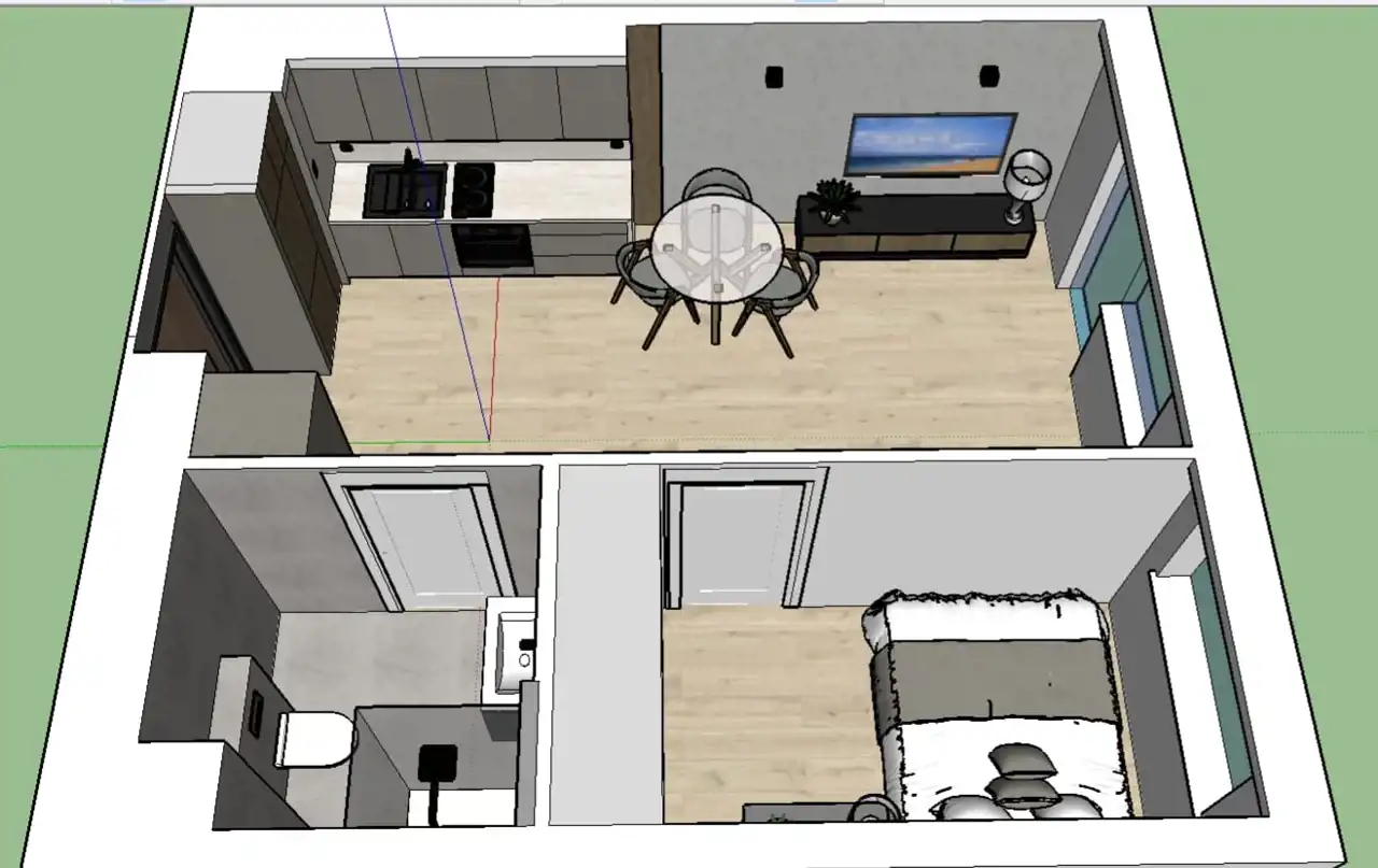Na powierzchnię 36 m2 składają się salon z aneksem kuchennym, sypialnia, łazienka z WC