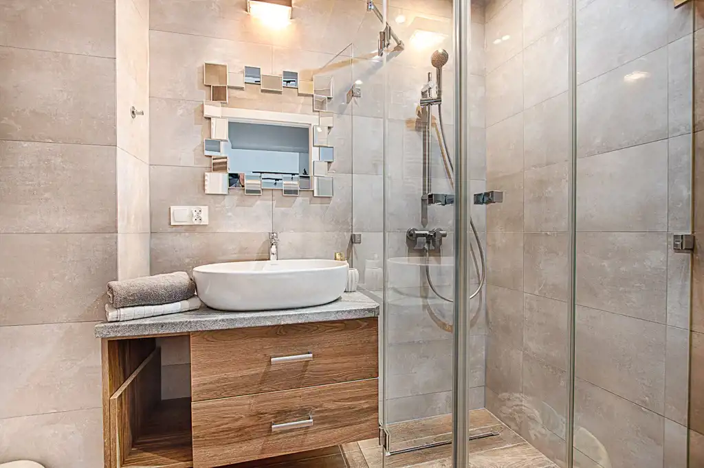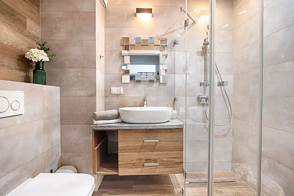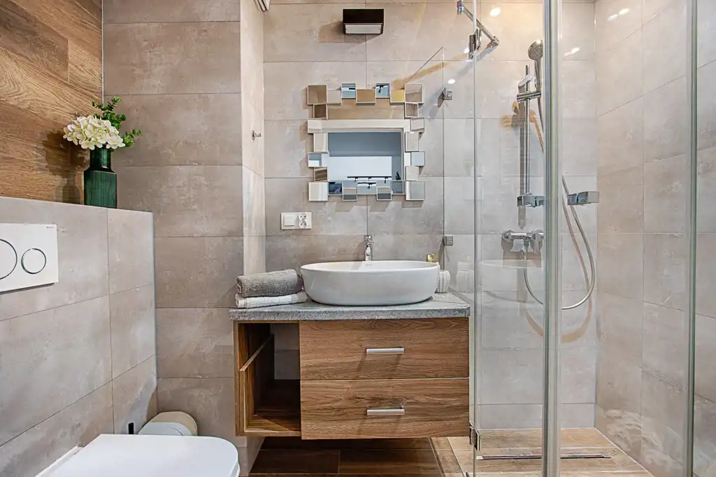 - łazienkę z wc, kabiną prysznicową oraz pralką.