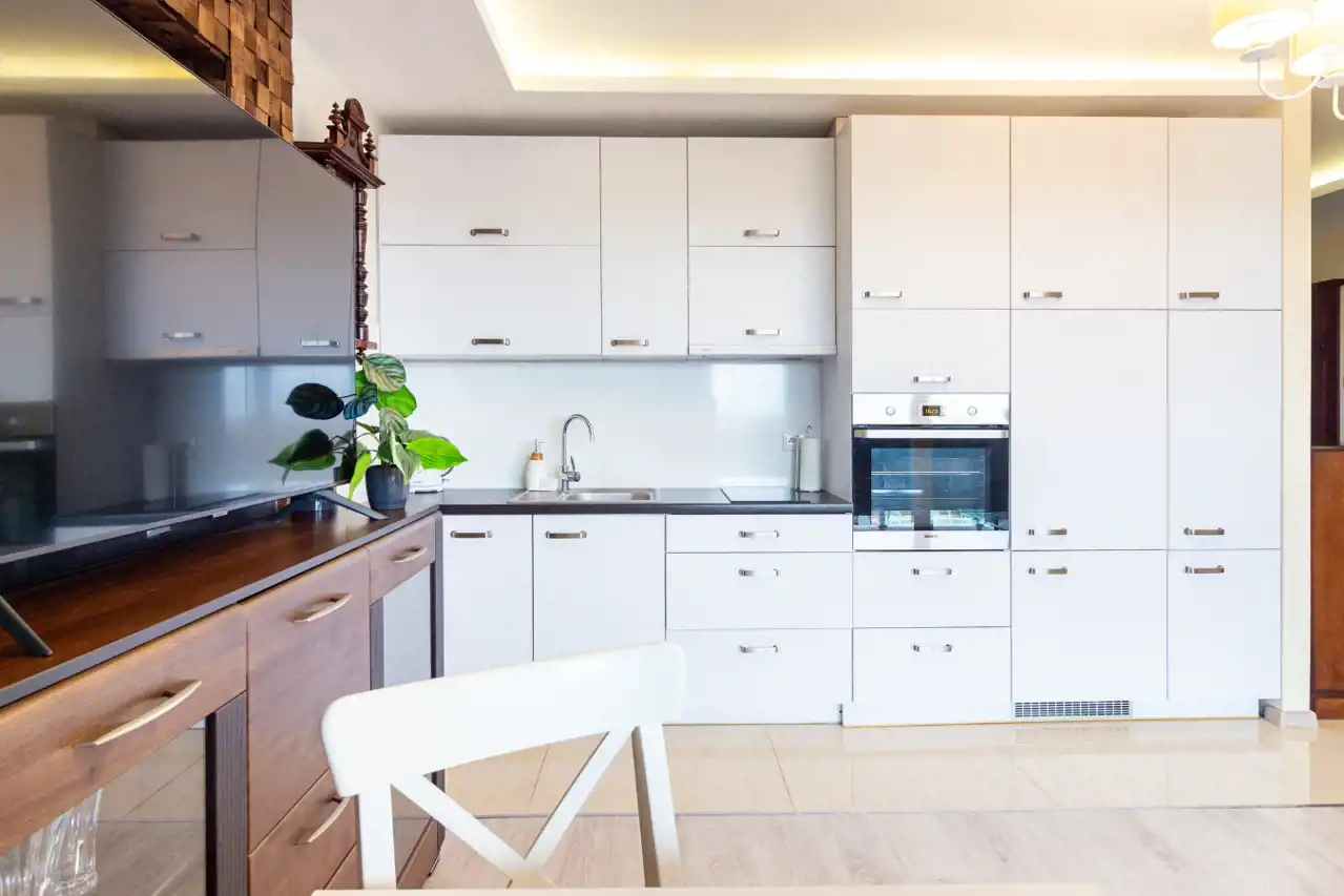 - salon z aneksem kuchennym (zabudowa + sprzęt AGD: zmywarka, lodówka, piekarnik, płyta indukcyjna),