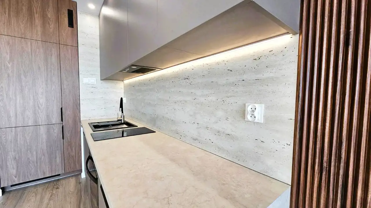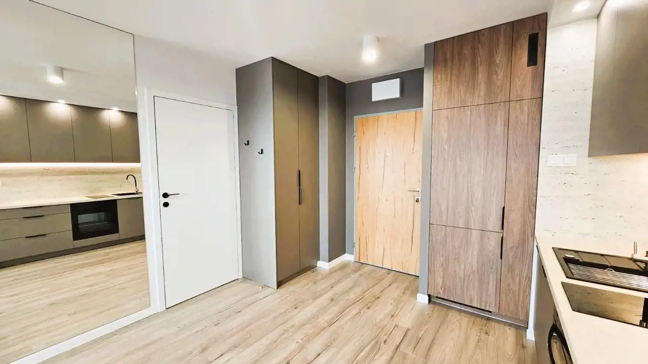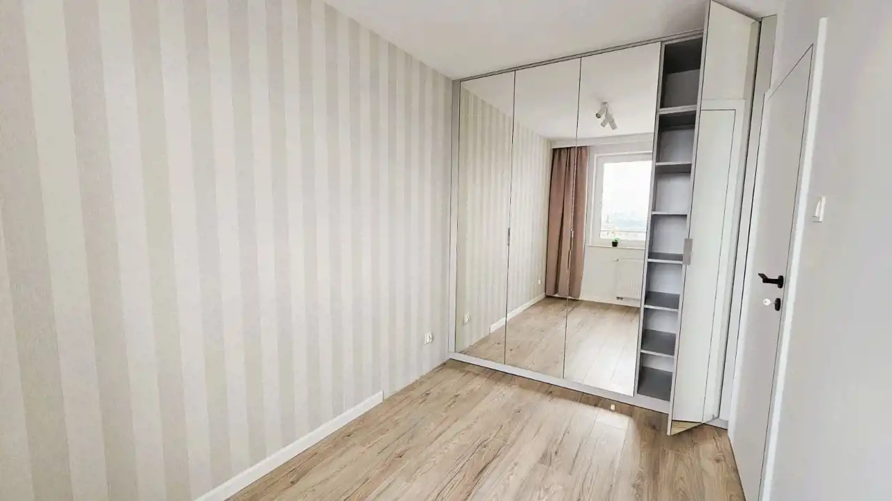 - zabudowy stałe na wymiar w całym mieszkaniu (kuchnia, przedpokój, sypialnia)