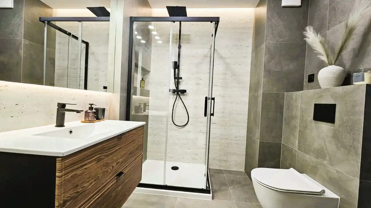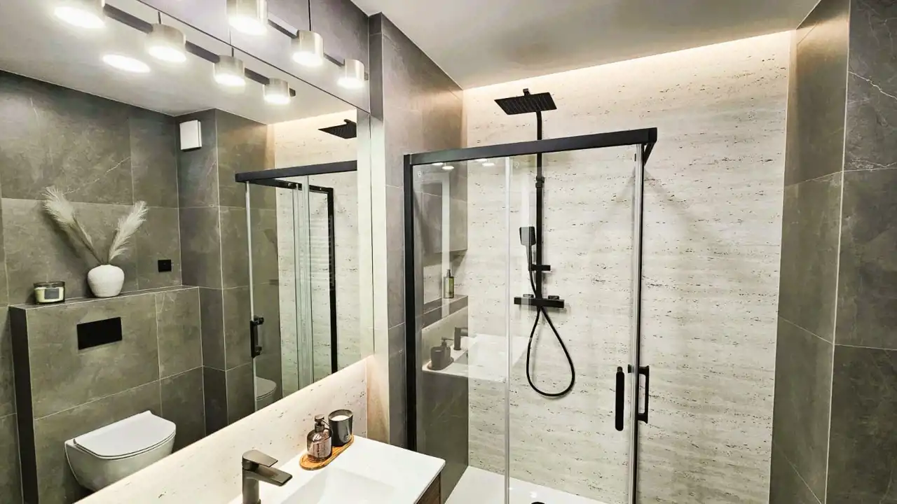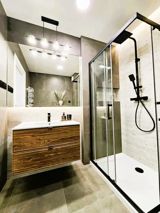 - łazienka: prostokątna kabina prysznicowa z zabudową, WC podwieszane, umywalka 80 cm z szafką, przygotowane podłączenie pod pralkę